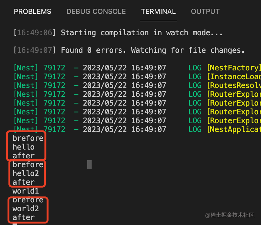 }可以看到,hello、hello2、world2 的路由都调用了这个中间件,而 world1 没有: