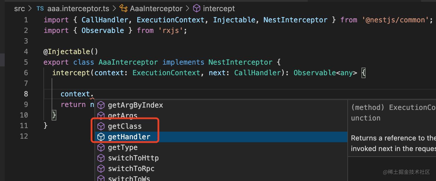middleware 和 interceptor 功能类似,但也有不同,interceptor 可以拿到目标 class、handler 等,也可以调用 rxjs 的 operator 来处理响应,更适合处理具体的业务逻辑。