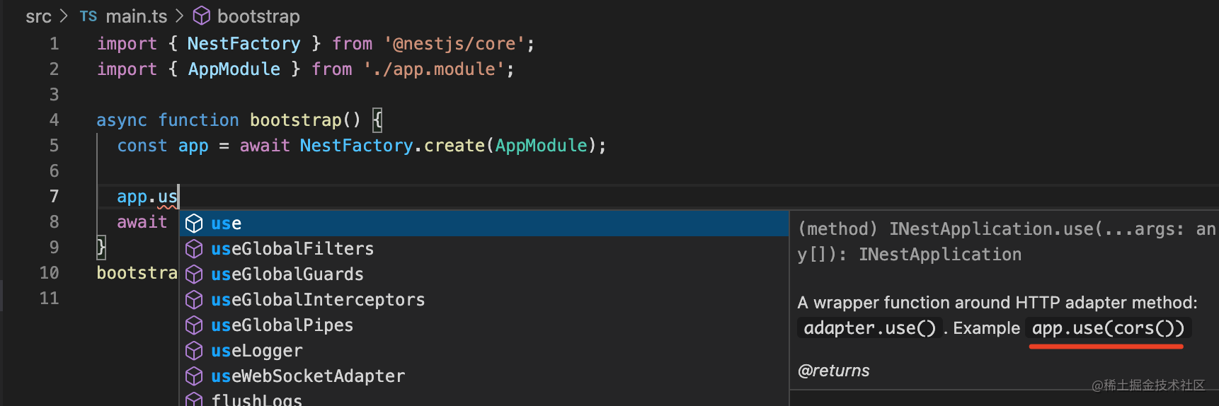 app.use 也可以应用中间件,但更建议在 AppModule 里的 configure 方法里指定。
