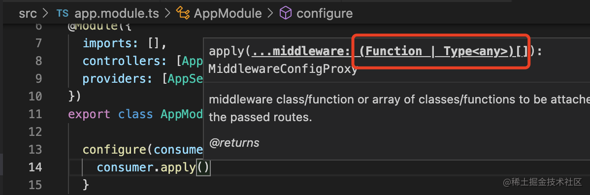 用法是 Module 实现 NestModule 的 configure 方法,调用 apply 和 forRoutes 指定什么中间件作用于什么路由。
