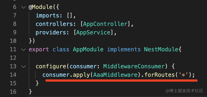 }实现 NestModule 接口的 configure 方法,在里面应用 AaaMiddleware 到所有路由。