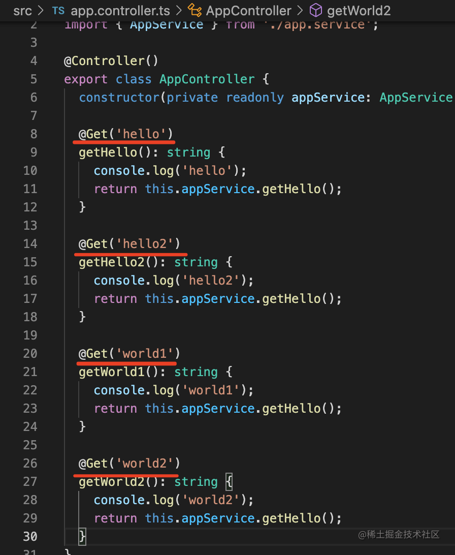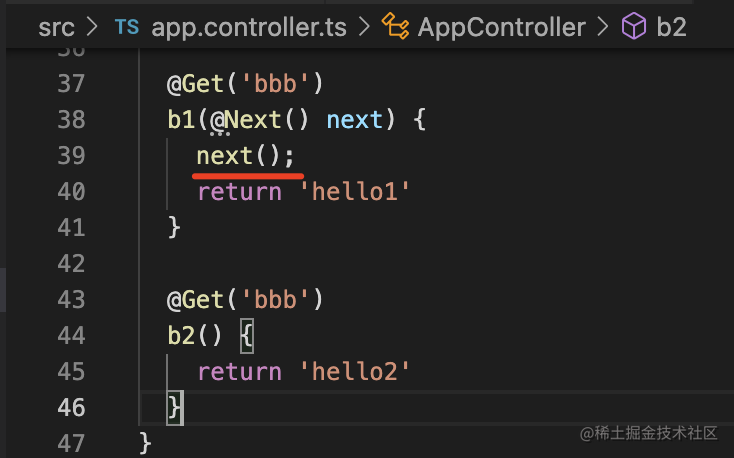 Nest 还有个 @Next 装饰器,这个是用于调用下个 handler 处理的,当用了这个装饰器之后,Nest 就不会把 handler 返回值作为响应了。