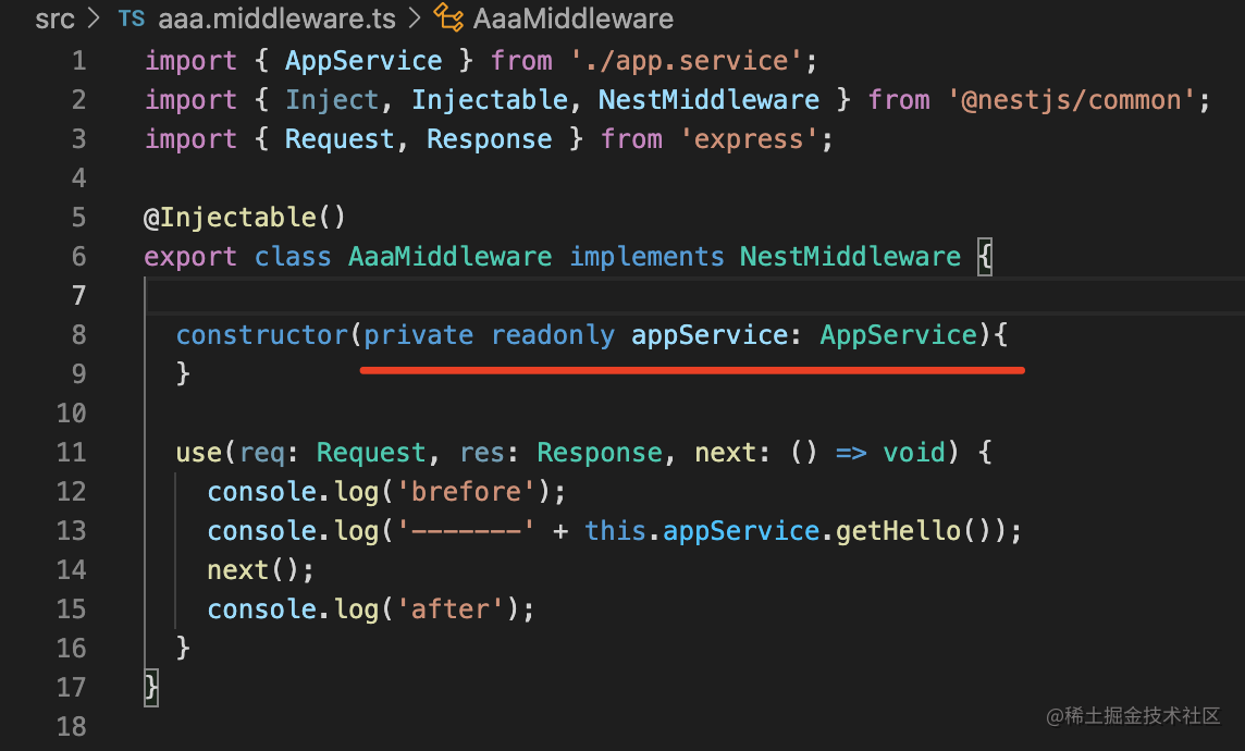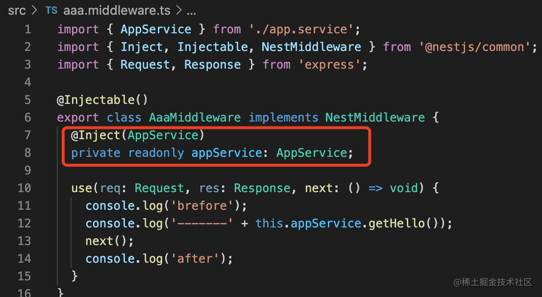 我们通过 @Inject 注入 AppService 到 middleware 里: