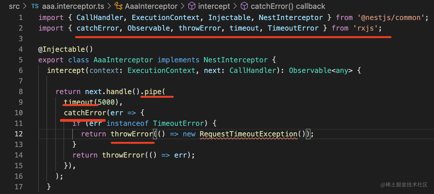 再就是 interceptor 里是可以用 rxjs 的操作符来组织响应处理流程的:
