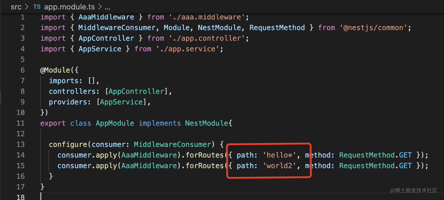 consumer.apply(AaaMiddleware).forRoutes({ path: 'world2', method: RequestMethod.GET });