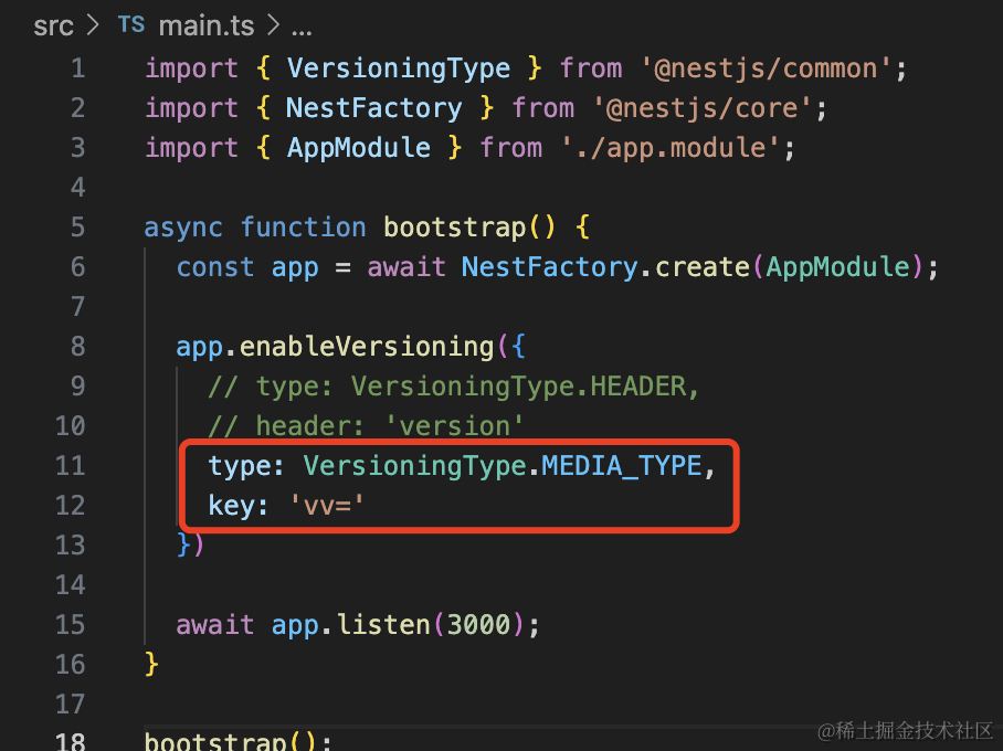 在 main.ts 里调用 enableVersioning 开启接口版本功能: