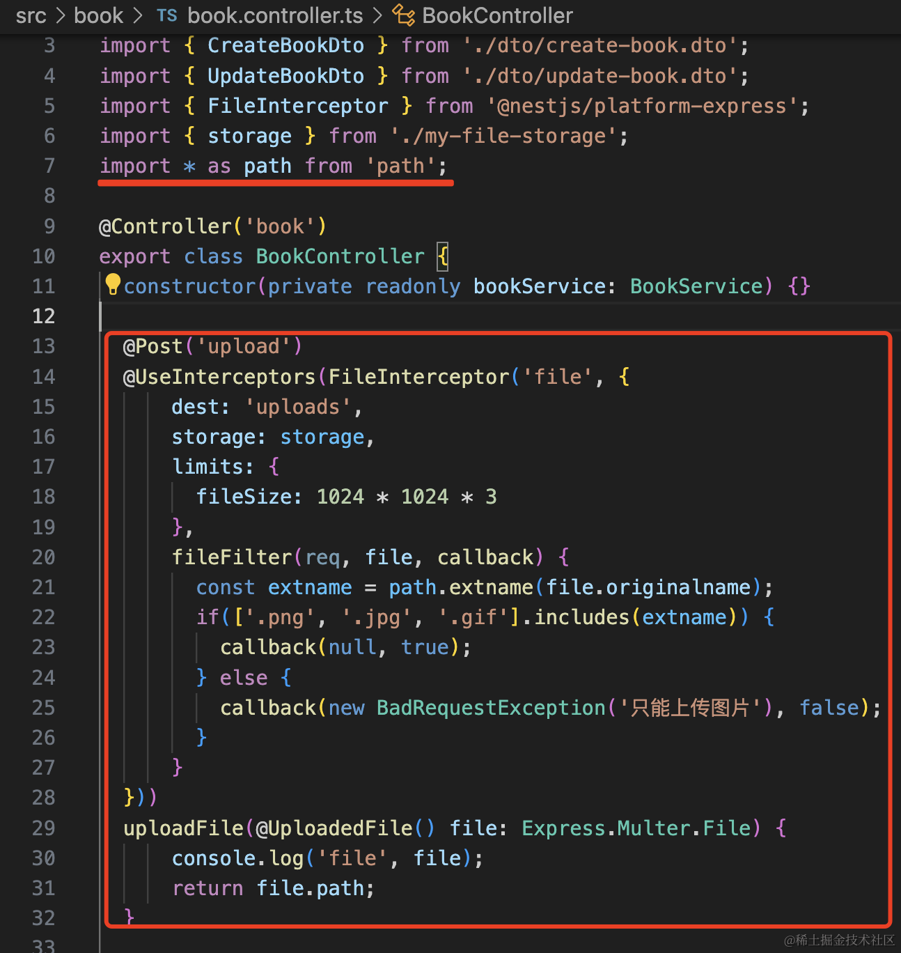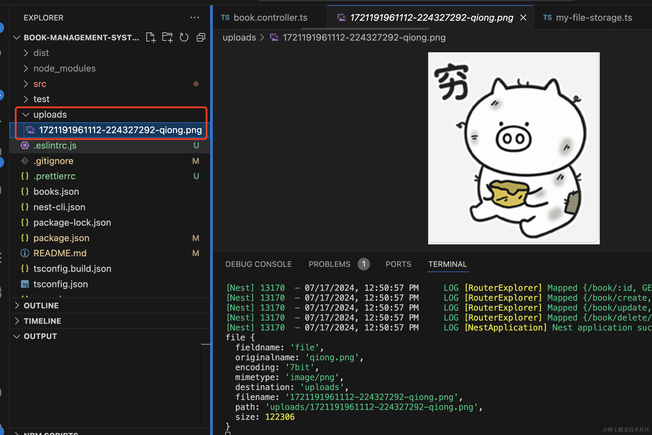 npm install -save-dev @types/multer然后在 BookController 添加一个 /book/upload 接口:
