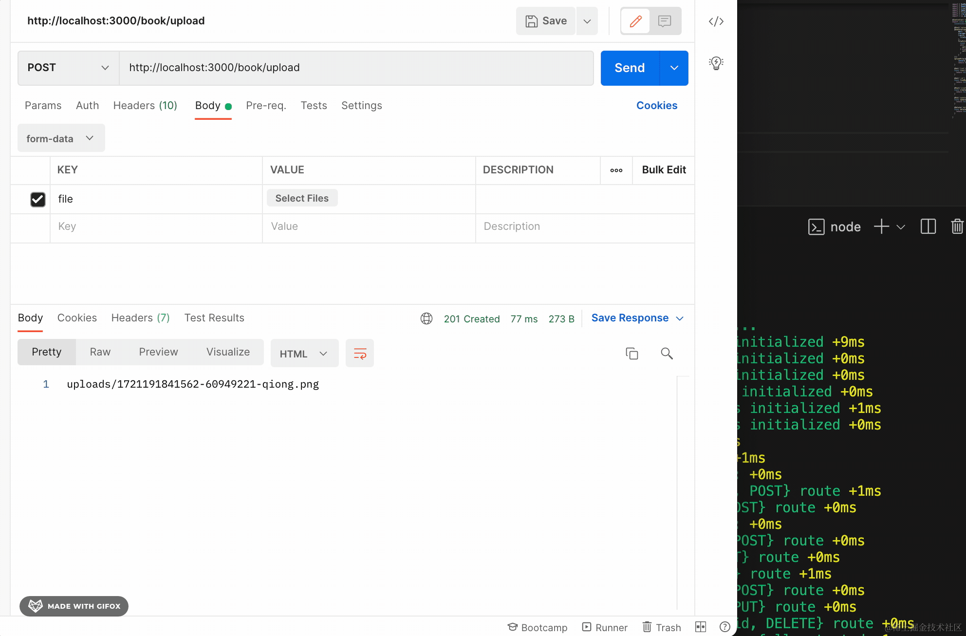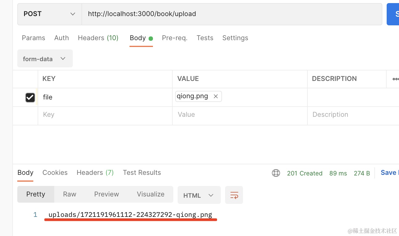 切换 body 格式为 form-data,添加一个 file 字段,然后选择一个文件: