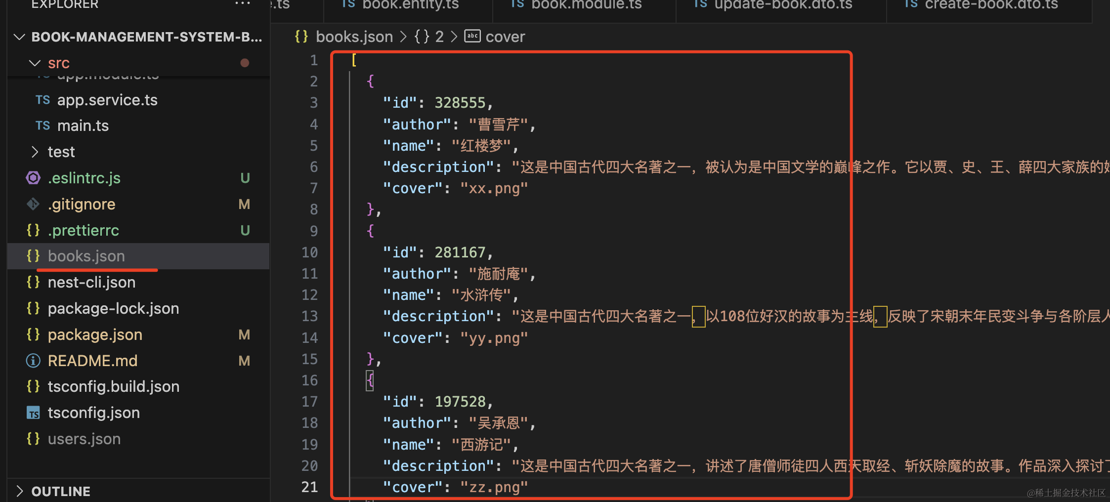 在 books.json 文件里保存了这三本书的数据:
