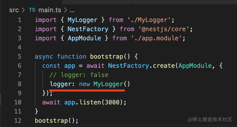 如果想在 Logger 注入一些 provider,就需要创建应用时设置 bufferLogs 为 true,然后用 app.useLogger(app.get(xxxLogger)) 来指定 Logger。