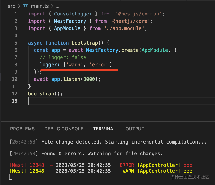 日志打印可以用 Nest 的 Logger,它支持在创建应用的时候指定 logger 是否开启,打印的日志级别,还可以自定义 logger。