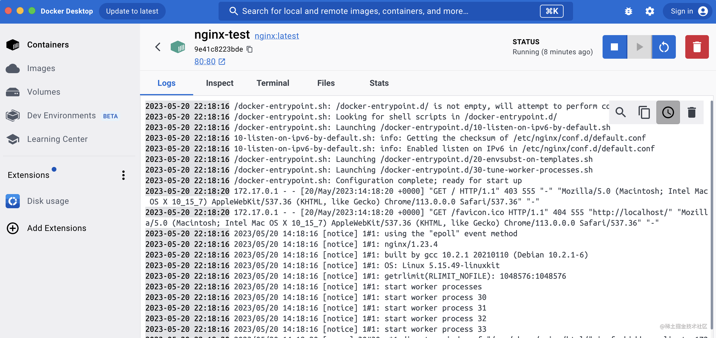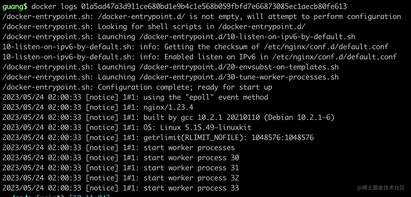 查看日志,对应 docker logs 命令: