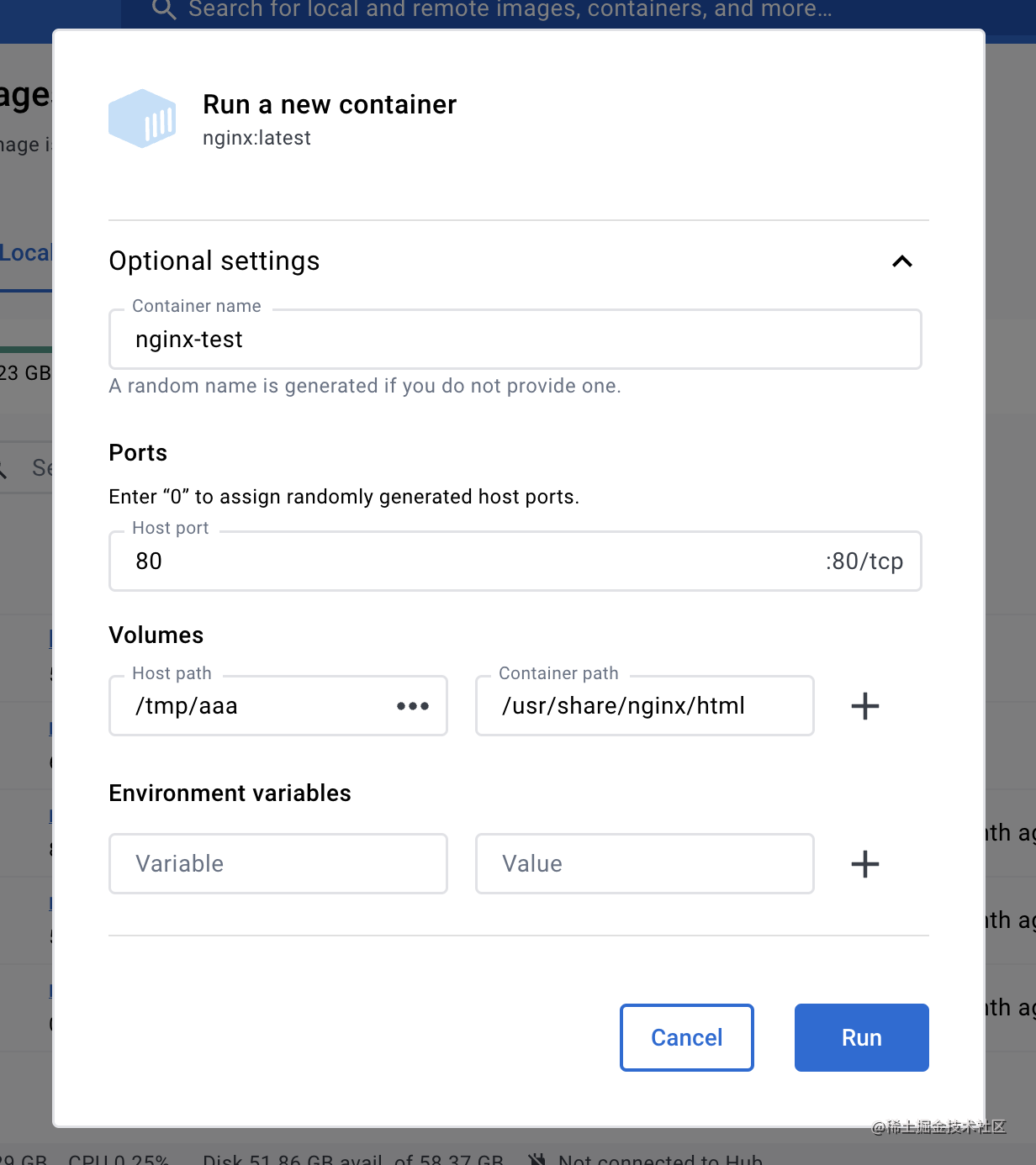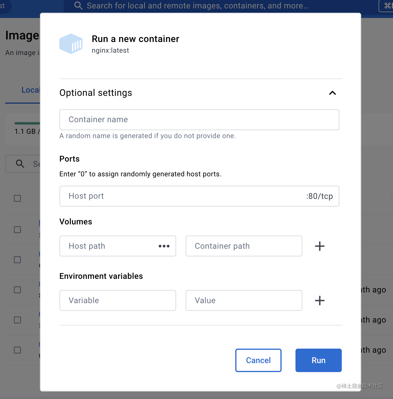 然后我们点击 run 按钮,填了个表单,就相当于执行了 docker run:
