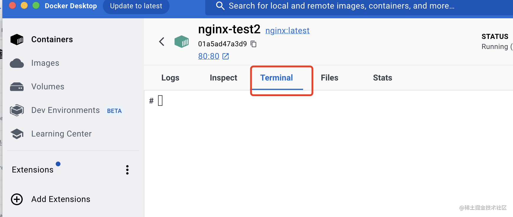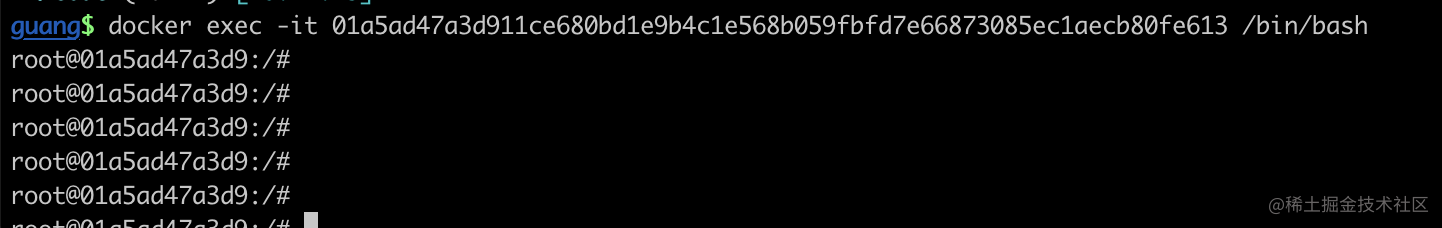 我们在容器的 terminal 里执行命令,对应的是 docker exec 命令: