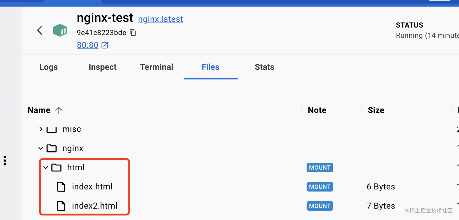 点击 files 标签就可以看到容器内的文件。