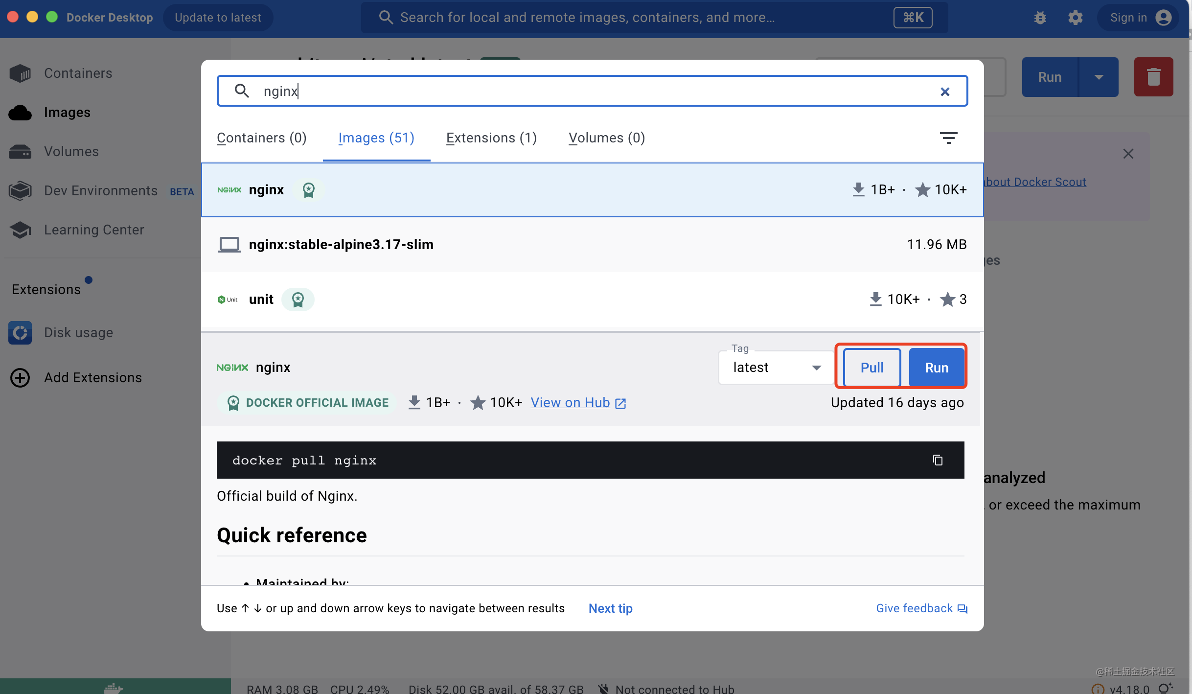 搜索 nginx 镜像,点击 pull(搜索这步需要翻墙,不然搜不到)。