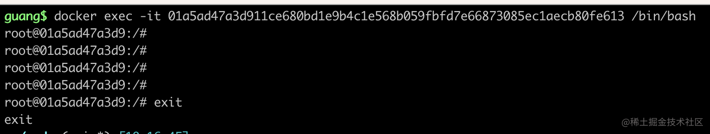 然后指定容器 id 和 shell 类型,就可以交互的方式在容器内执行命令了。