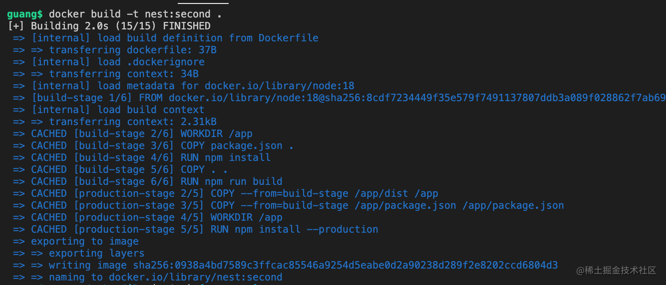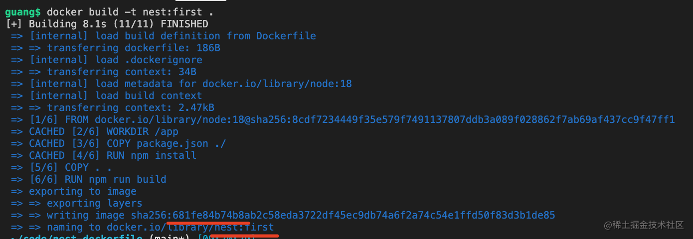docker build -t nest:first .镜像名为 nest、标签为 first,构建上下文是当前目录