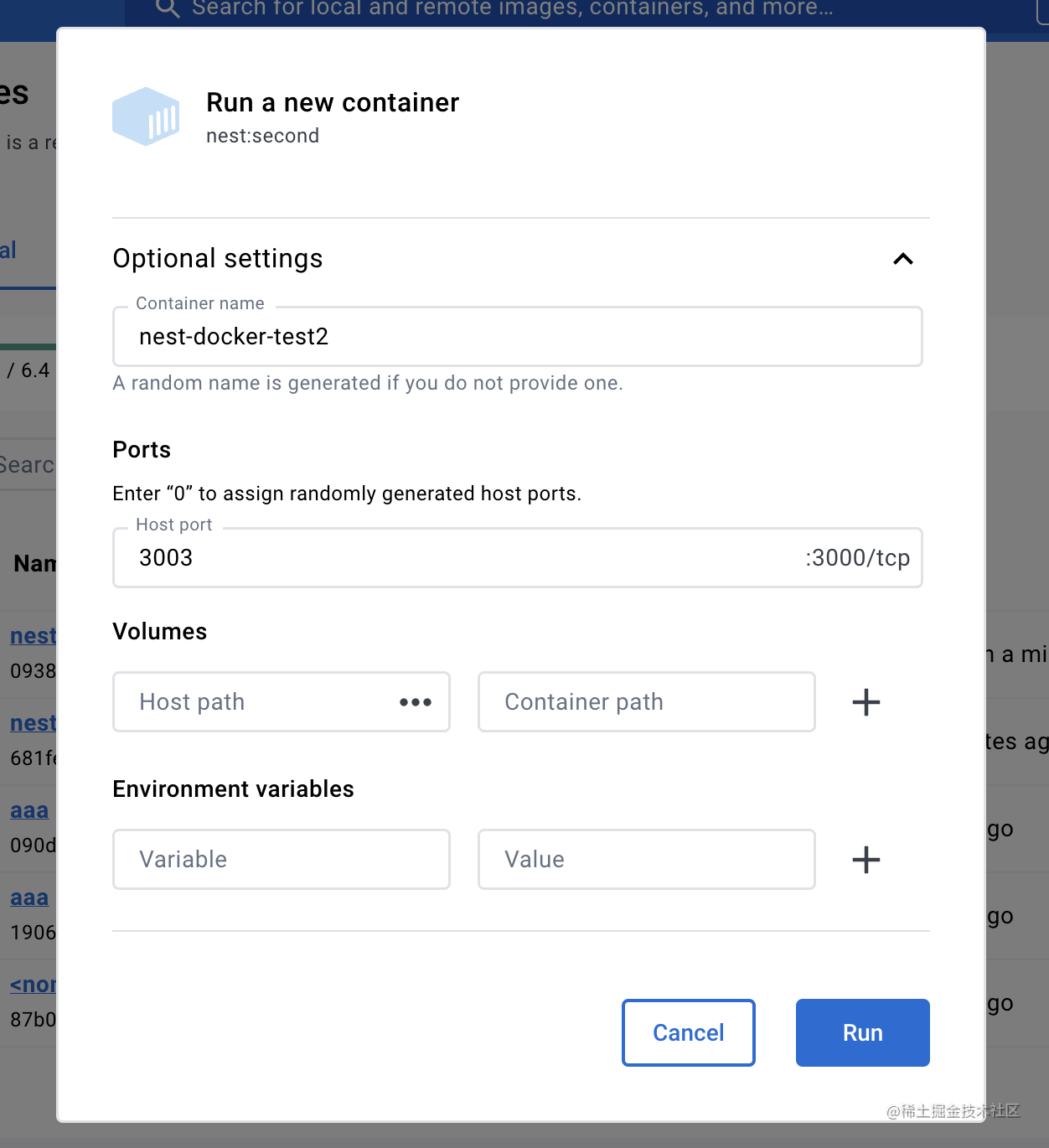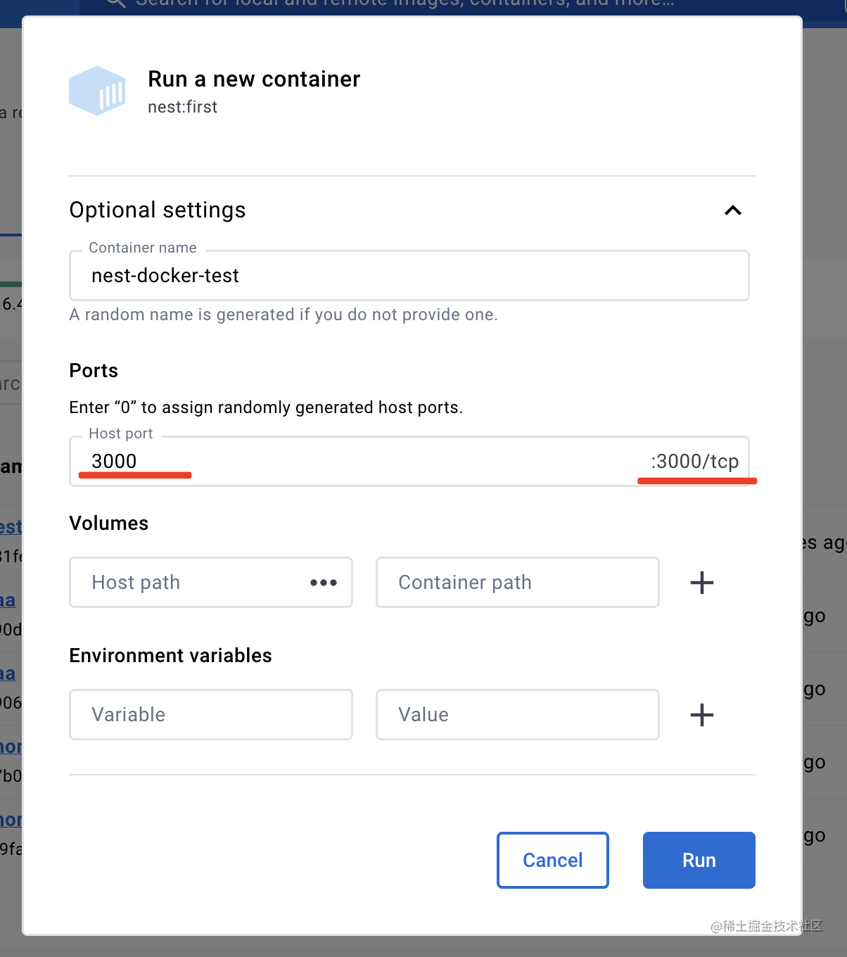 指定暴露的端口为 3000,容器跑起来以后执行 node ./dist/main.js 命令。