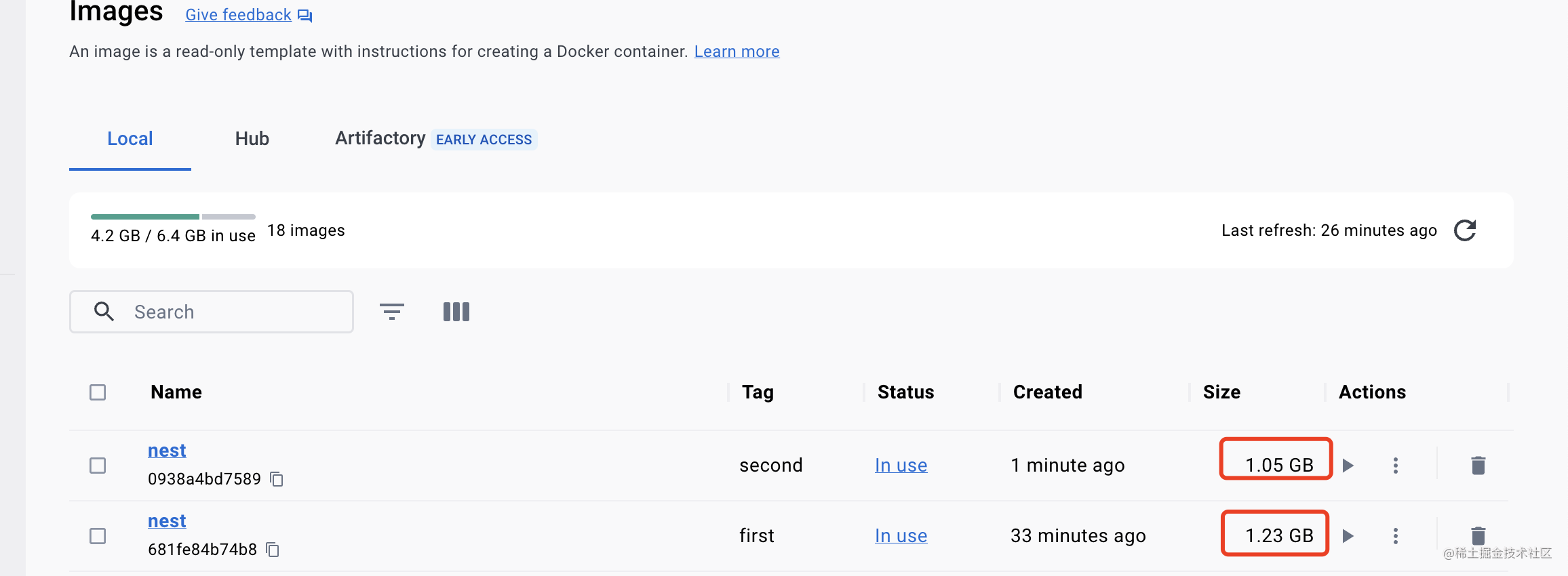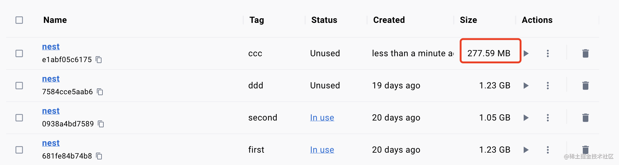 对比下镜像体积,明显看出有减小,少的就是 src、test、构建阶段的 node_modules 这些文件: