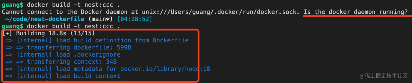 我没启动 docker daemon 的时候是不能 build 的,启动之后才可以: