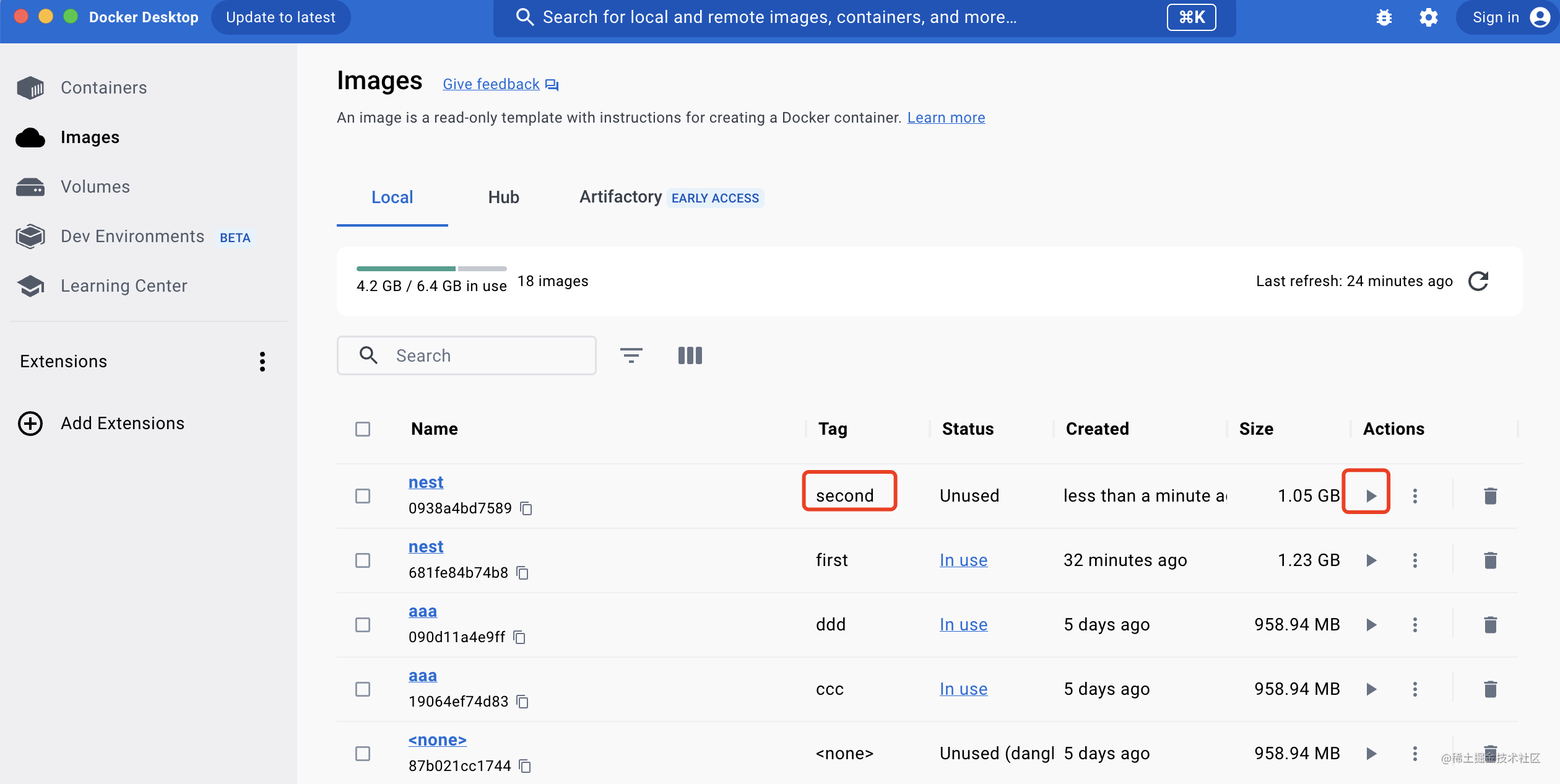 然后就可以在 docker desktop 里看到你构建出来的镜像了: