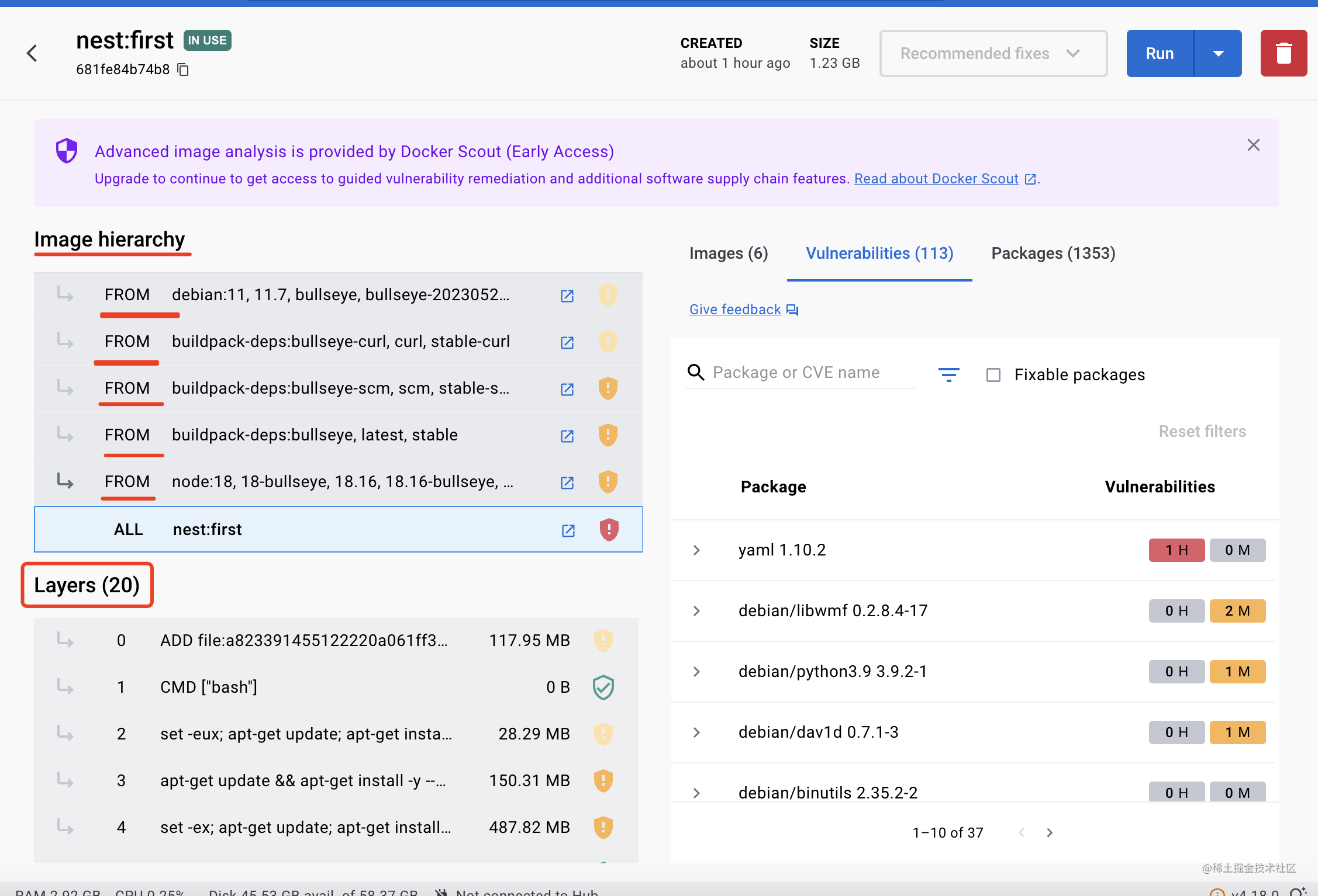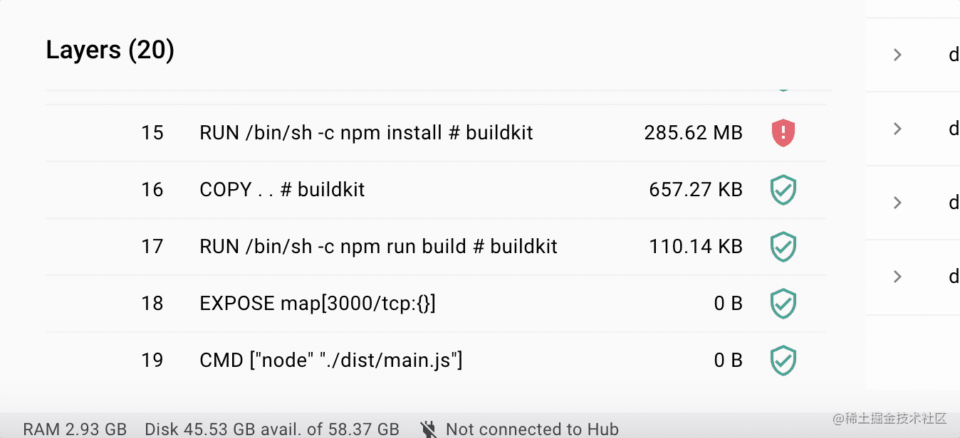 但是很多都是它继承的 node 镜像里的,可以看到每一层用了多少存储空间: