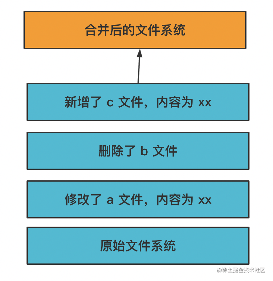 然后通过一种叫做 UnionFS 的机制把这些层合并起来,变成一个文件系统:
