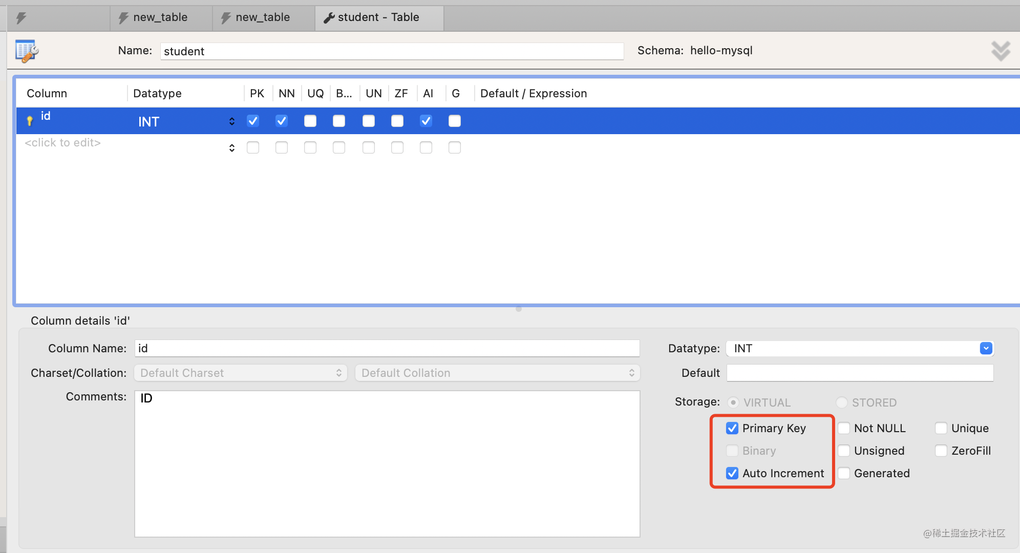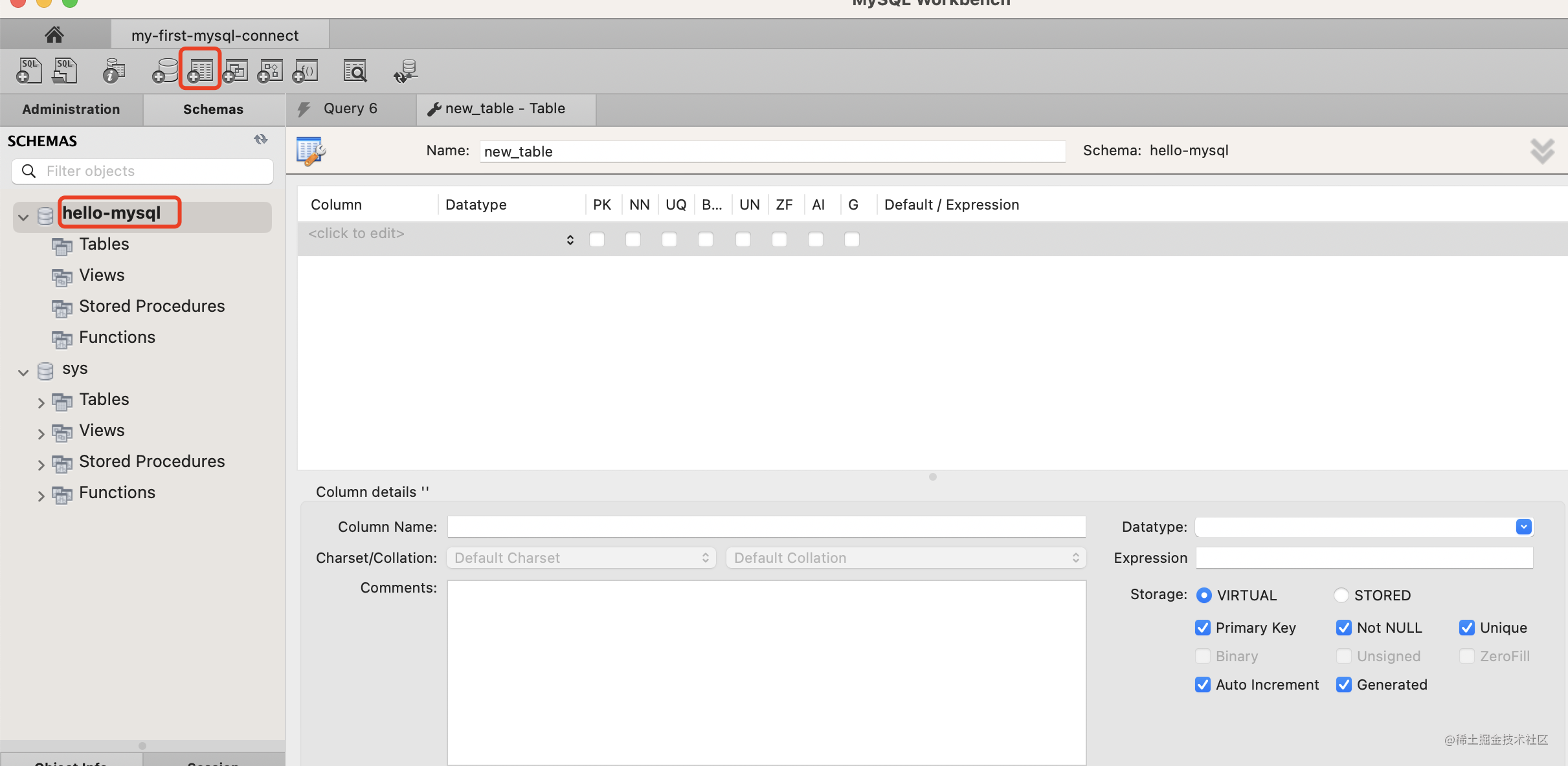 选中 hello-mysql 数据库,点击创建 table 的按钮,我们来建个表: