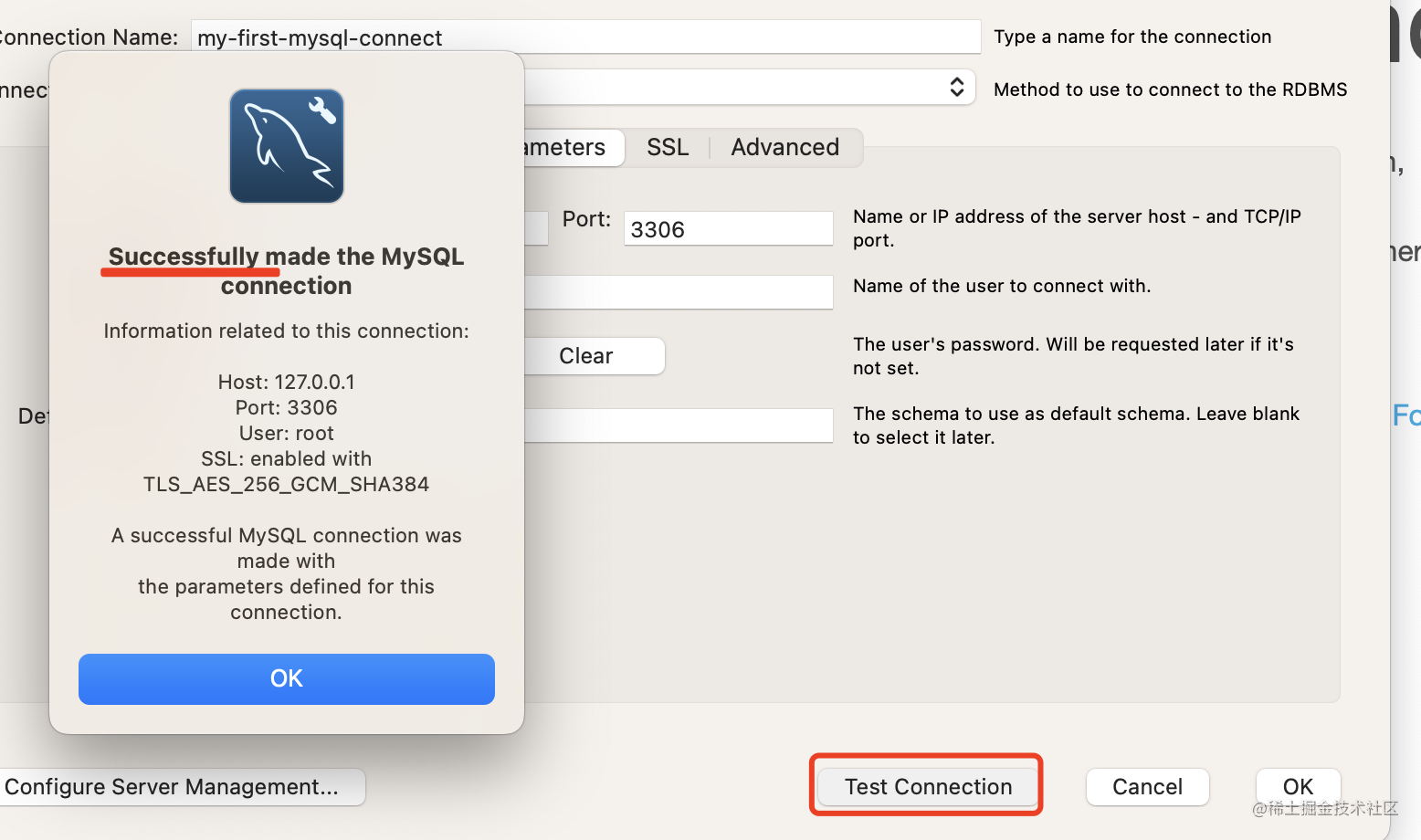之后你可以点击下 Test Connection 测试连接是否成功: