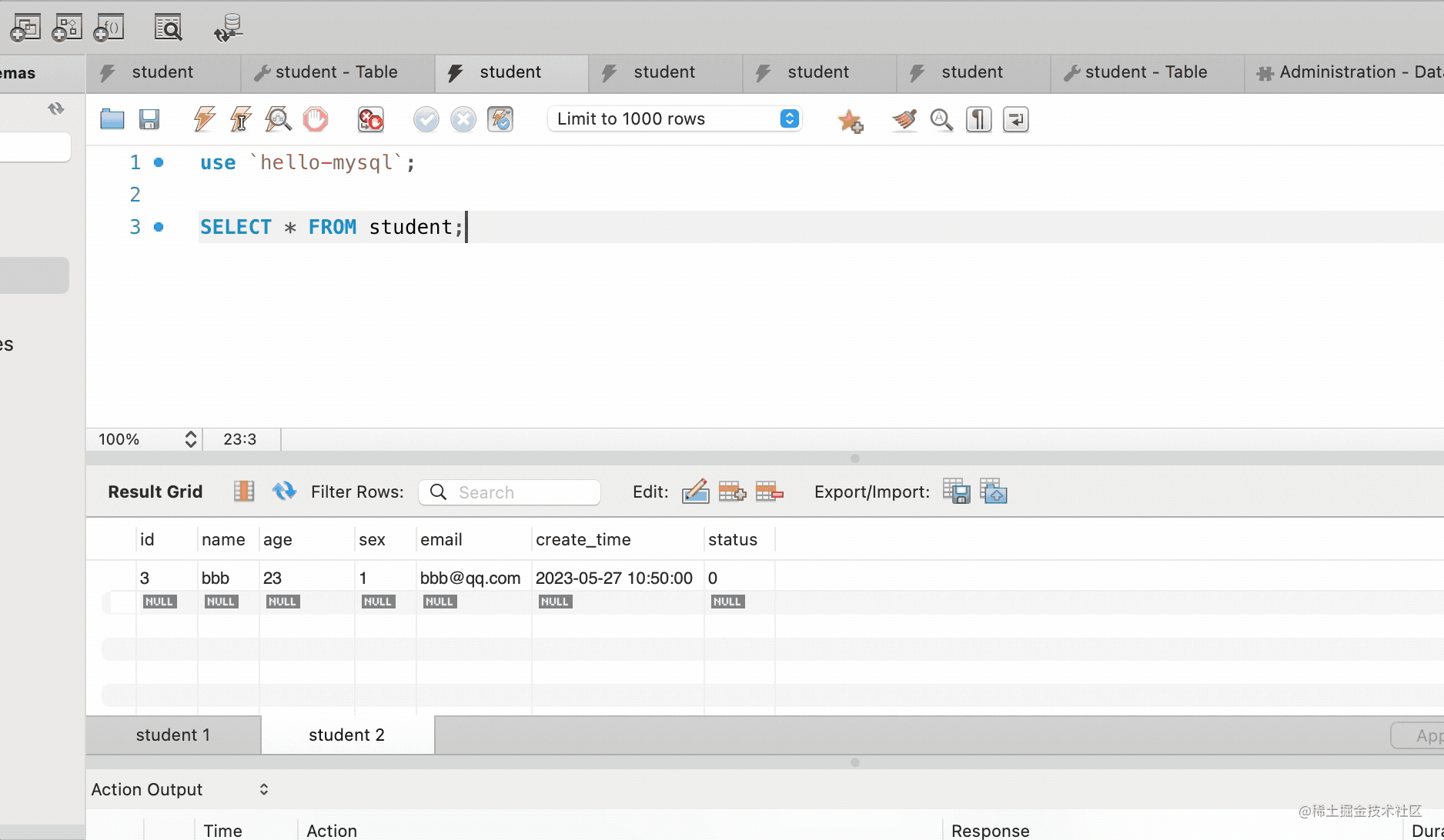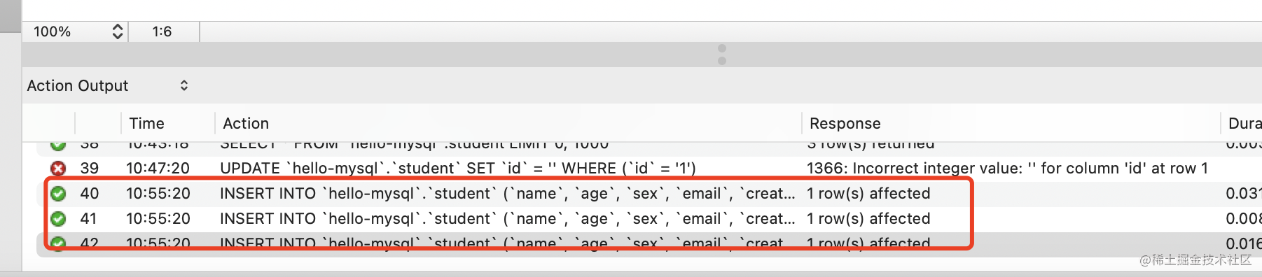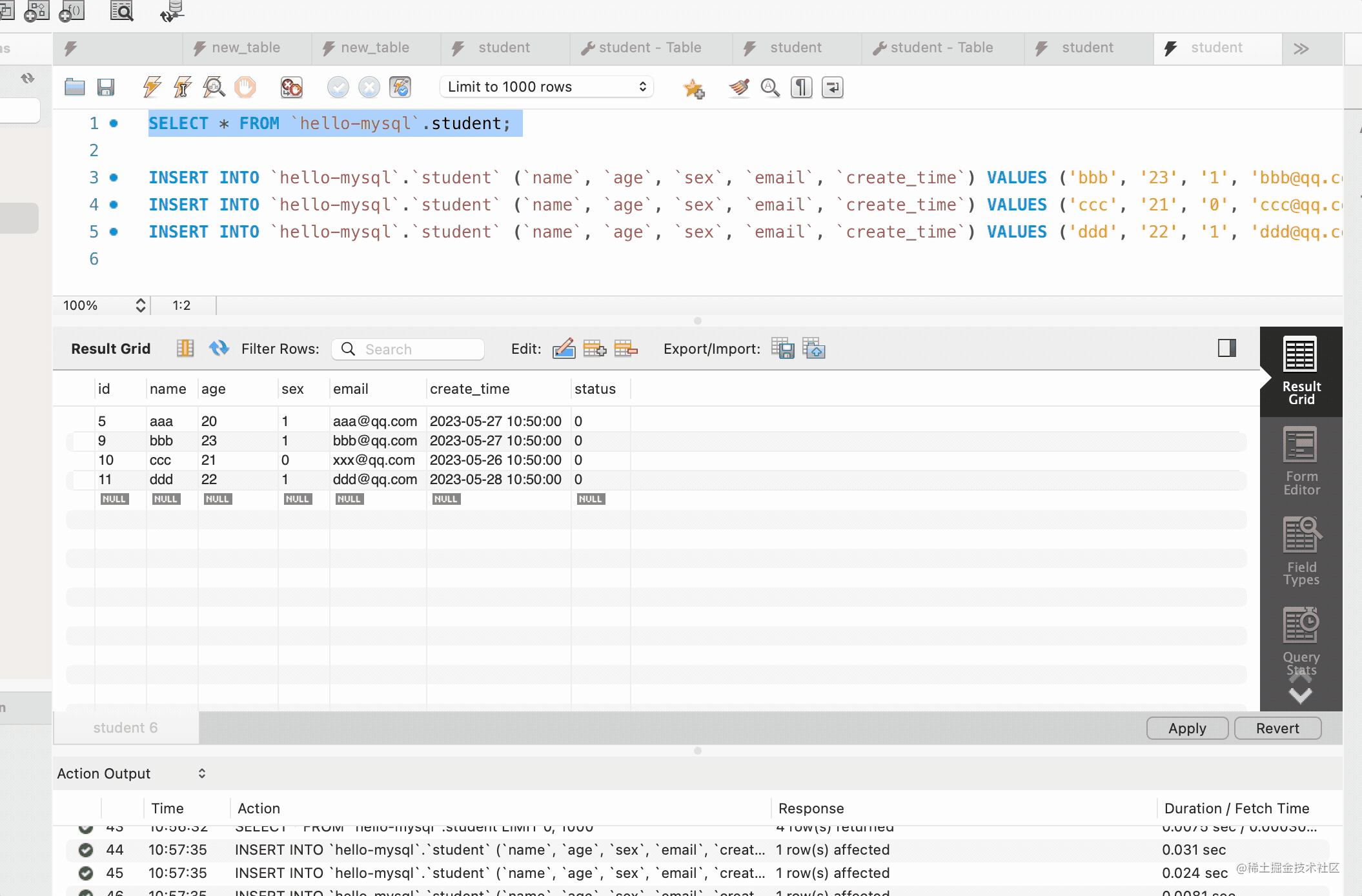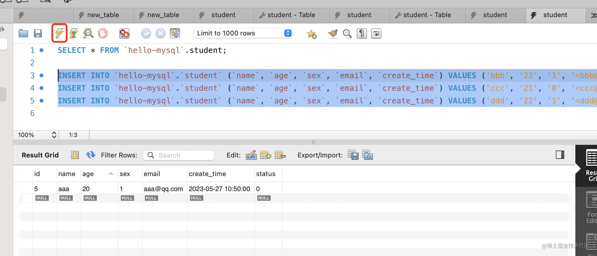 INSERT INTO `hello-mysql`.`student` (`name`, `age`, `sex`, `email`, `create_time`) VALUES ('ddd', '22', '1', 'ddd@qq.com', '2023-05-28 10:50:00');在上面的输入框输入这几条 sql,选中它们,然后点击执行 sql 的按钮: