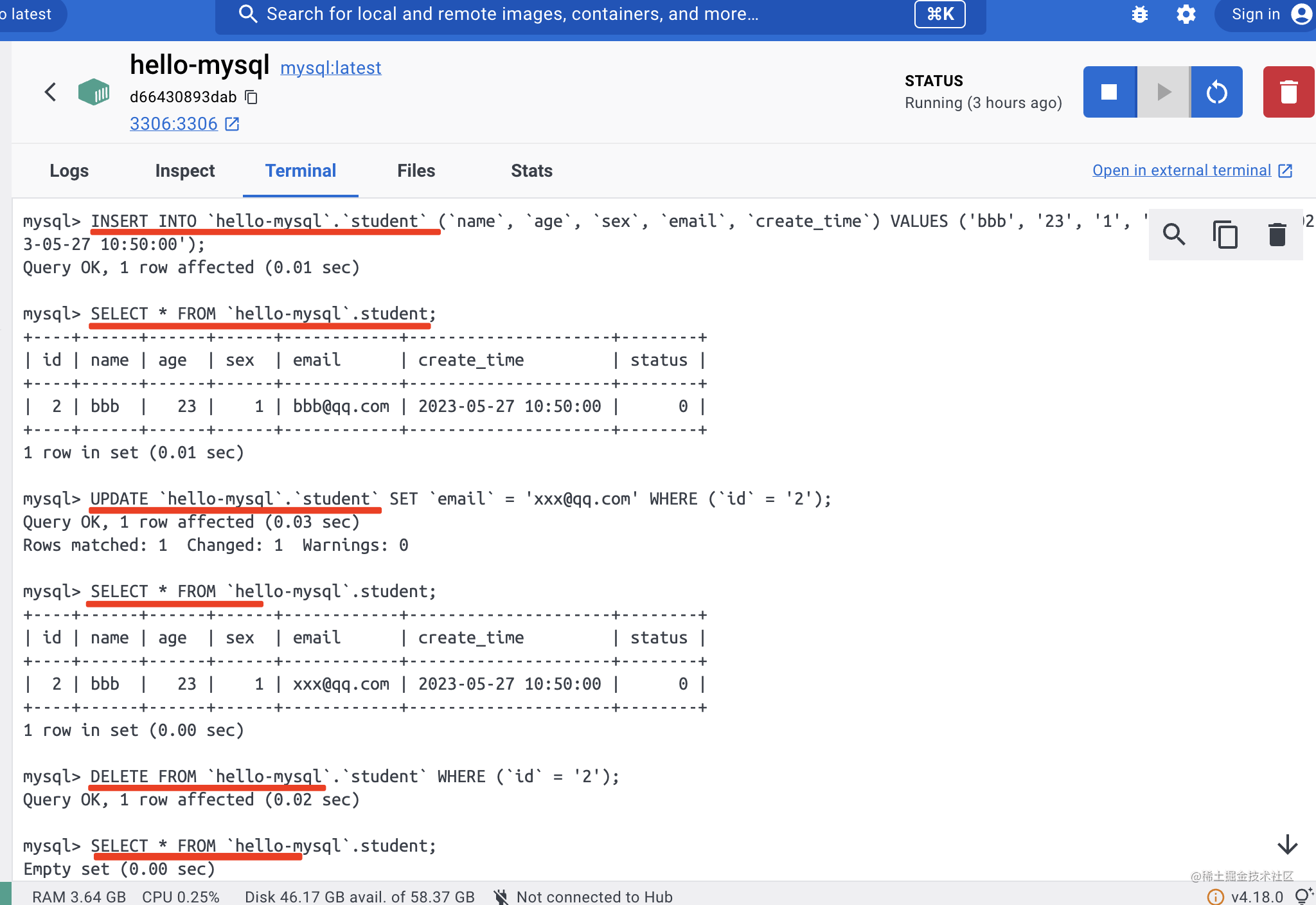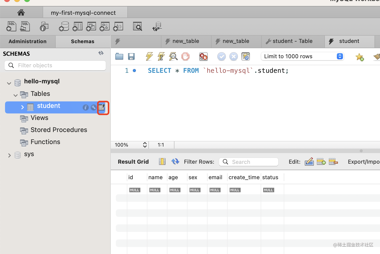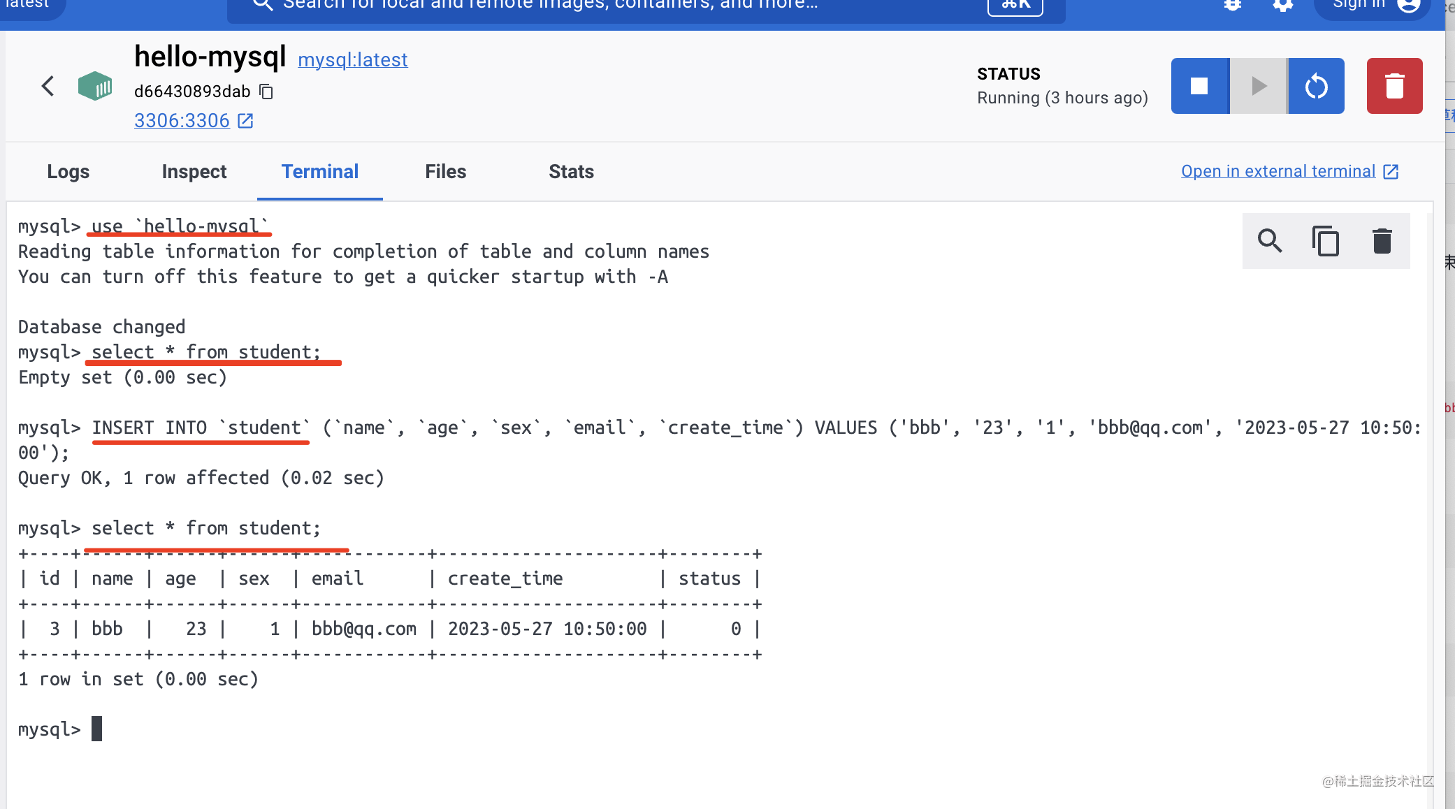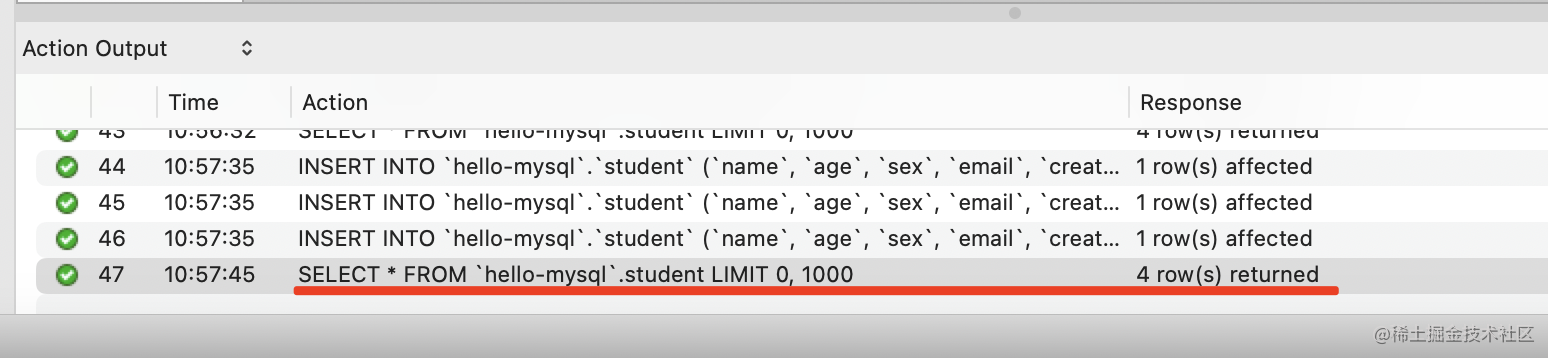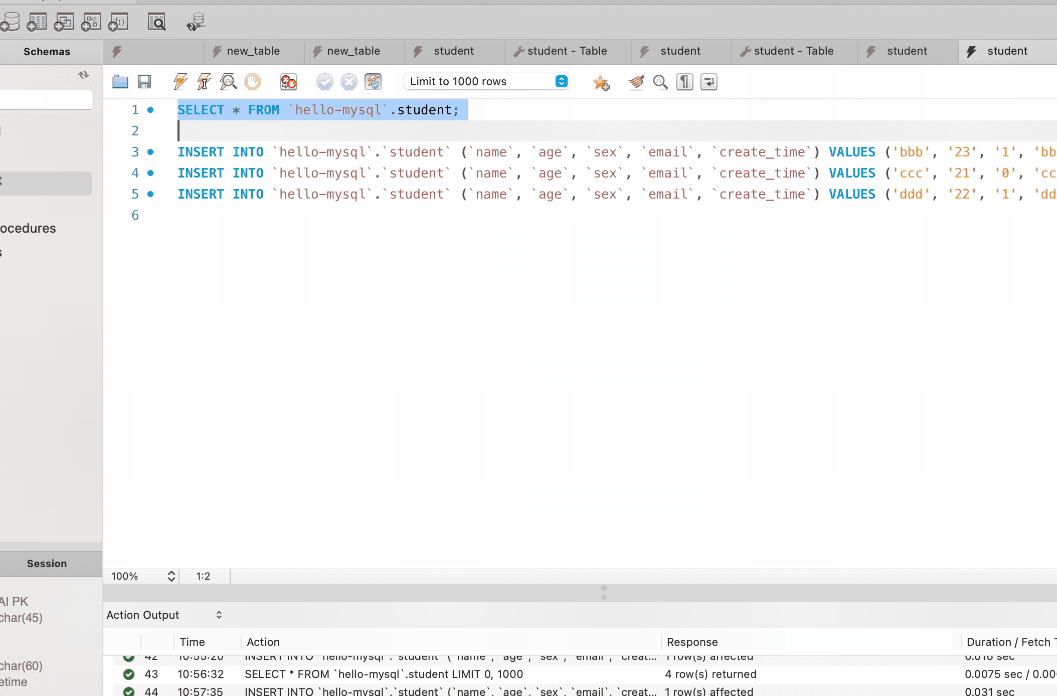 INSERT INTO `hello-mysql`.`student` (`name`, `age`, `sex`, `email`, `create_time`) VALUES ('ddd', '22', '1', 'ddd@qq.com', '2023-05-28 10:50:00');在上面的输入框输入这几条 sql,选中它们,然后点击执行 sql 的按钮: