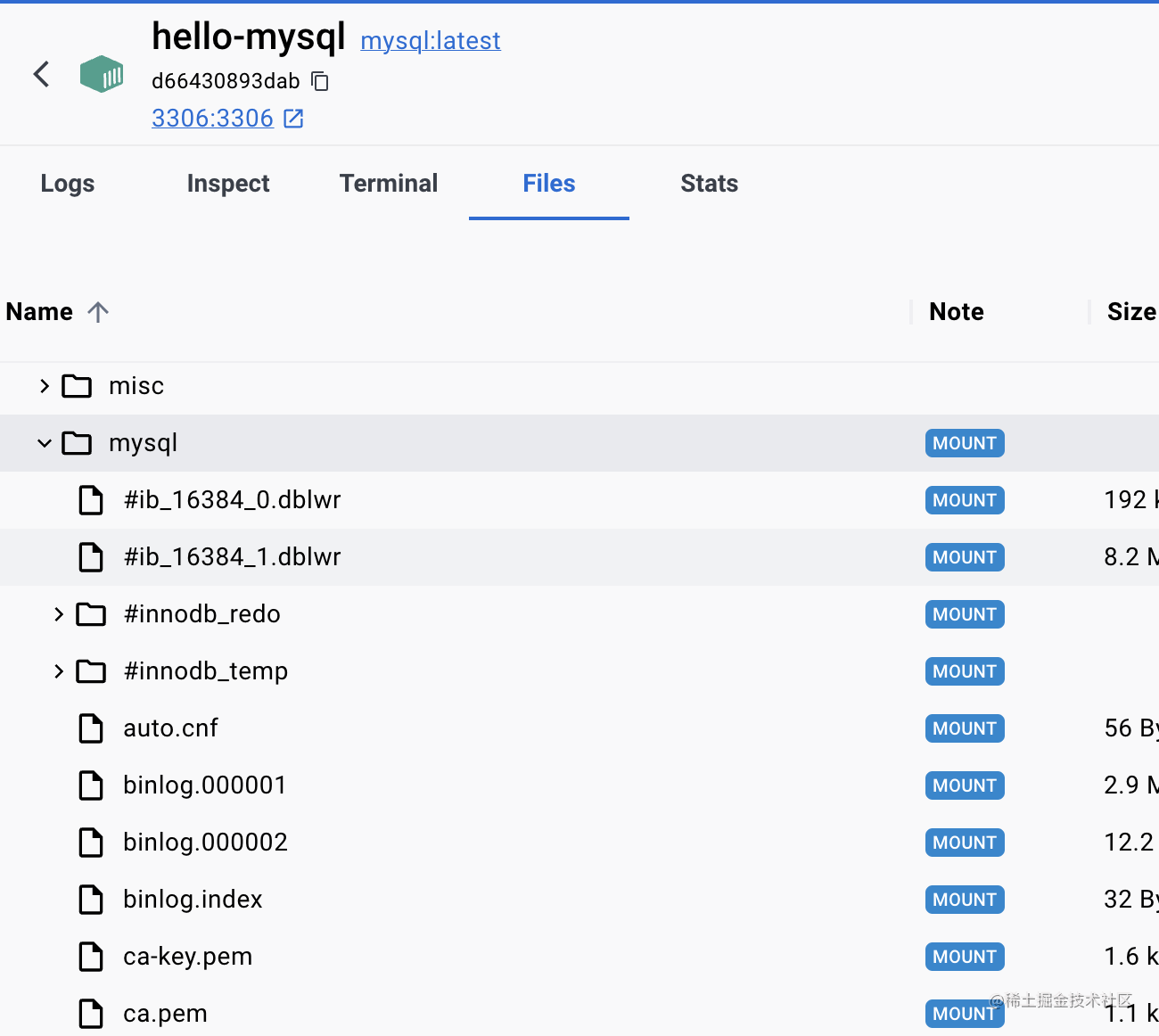 最后,还记得我们跑 mysql 镜像指定了个 volume 数据卷么?
