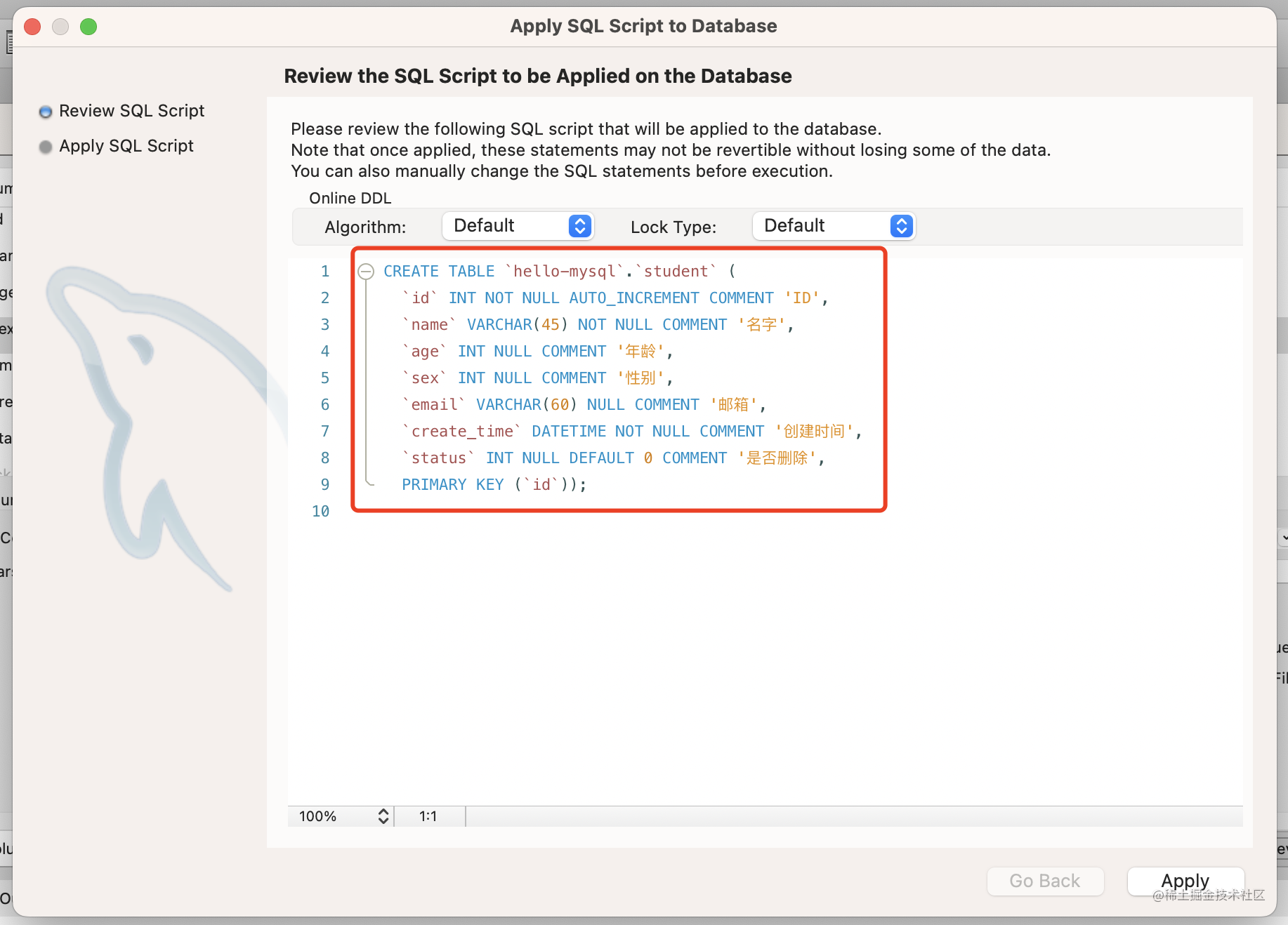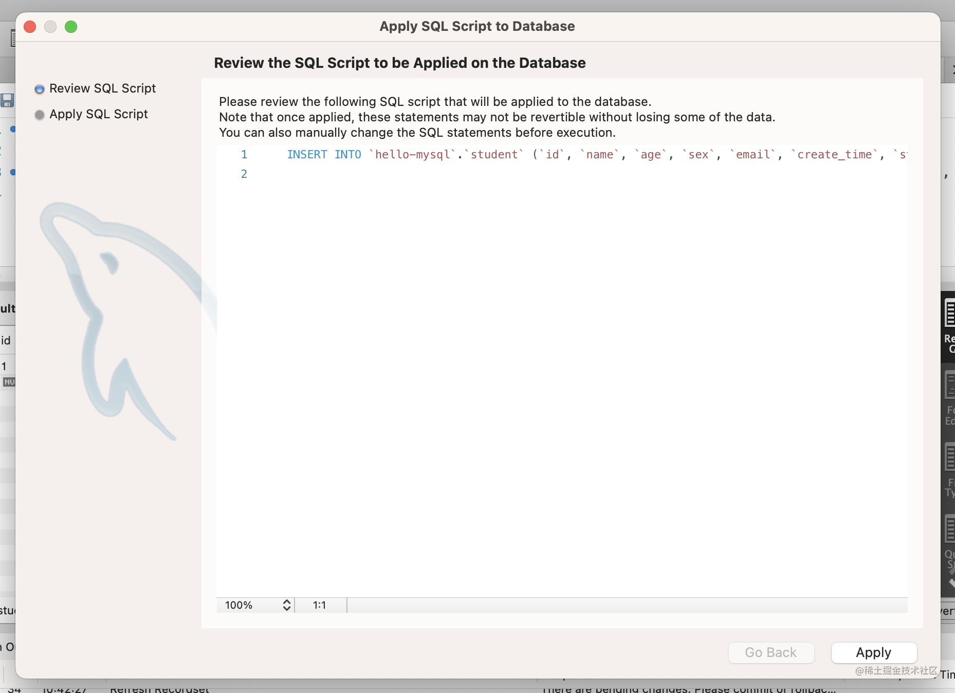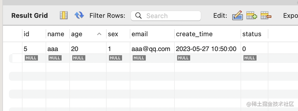 点击 apply 之后,mysql 会执行 sql,这时候就可以看到这条记录被插入了: