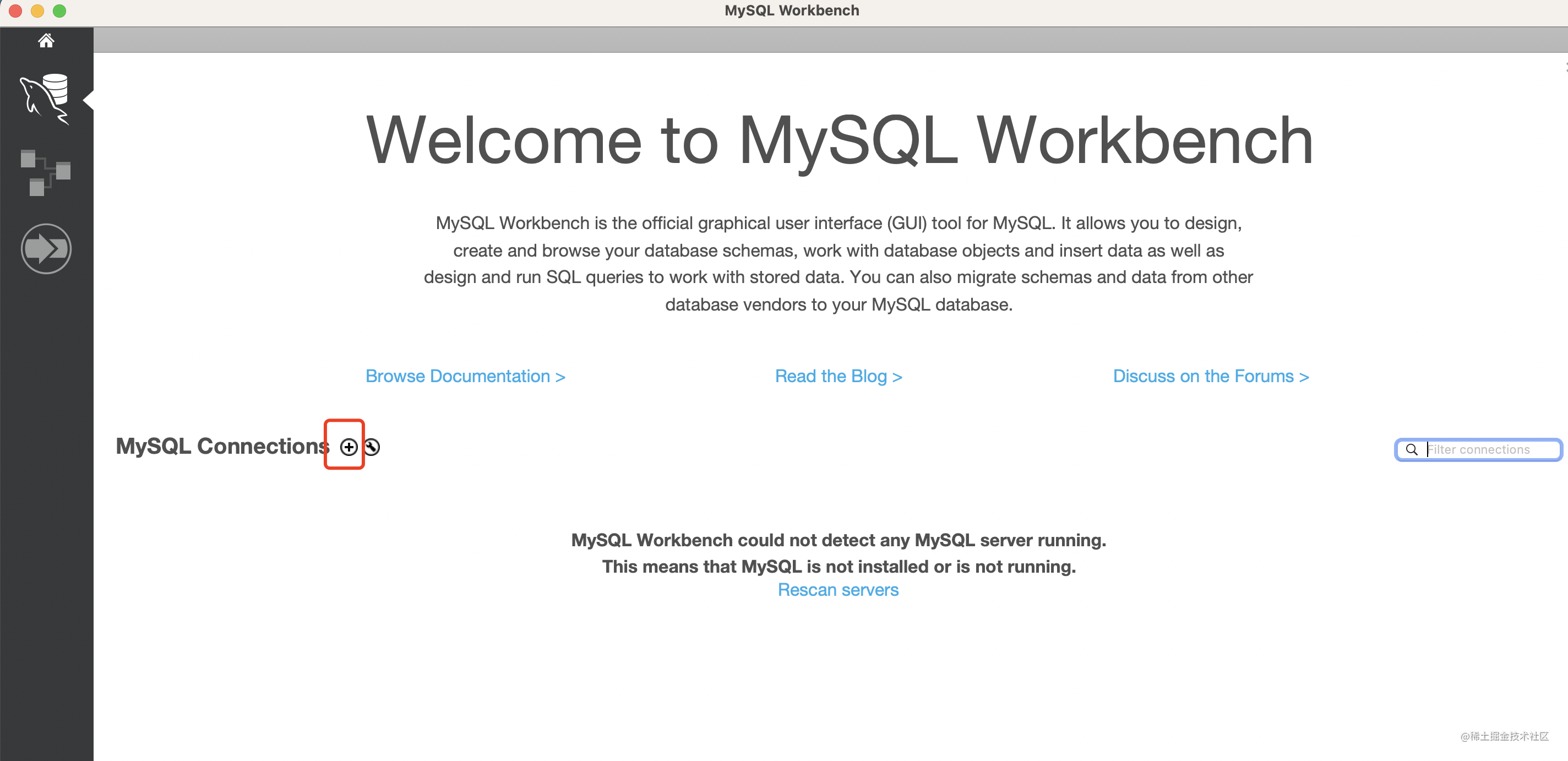 安装好后,打开 mysql workbench,点击这个 + 号: