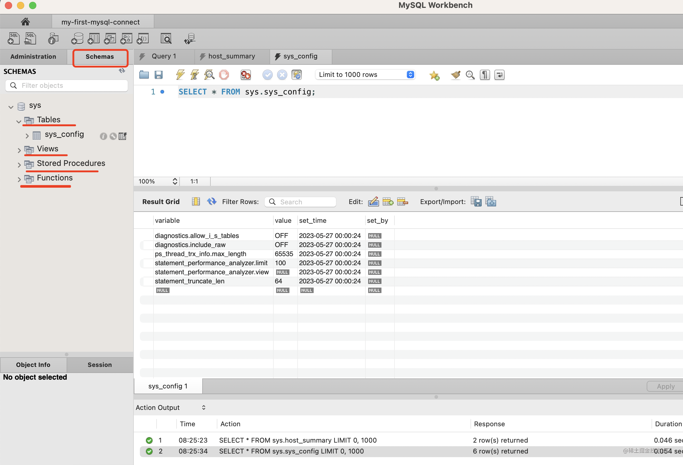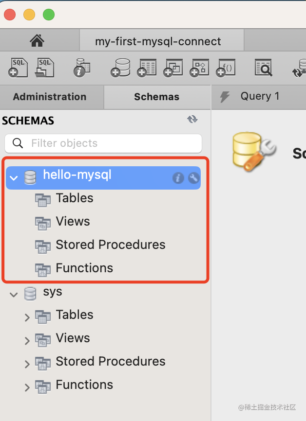 点击 schemas 就可以看到 mysql 现在已有的数据库和它下面的表、视图、存储过程、函数等: