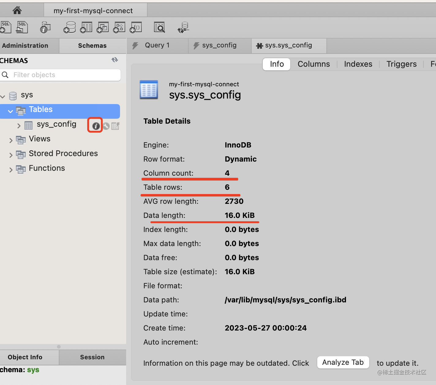 点击第一个图标,会展示表的信息,比如多少列、多少行、占据了多大的空间等: