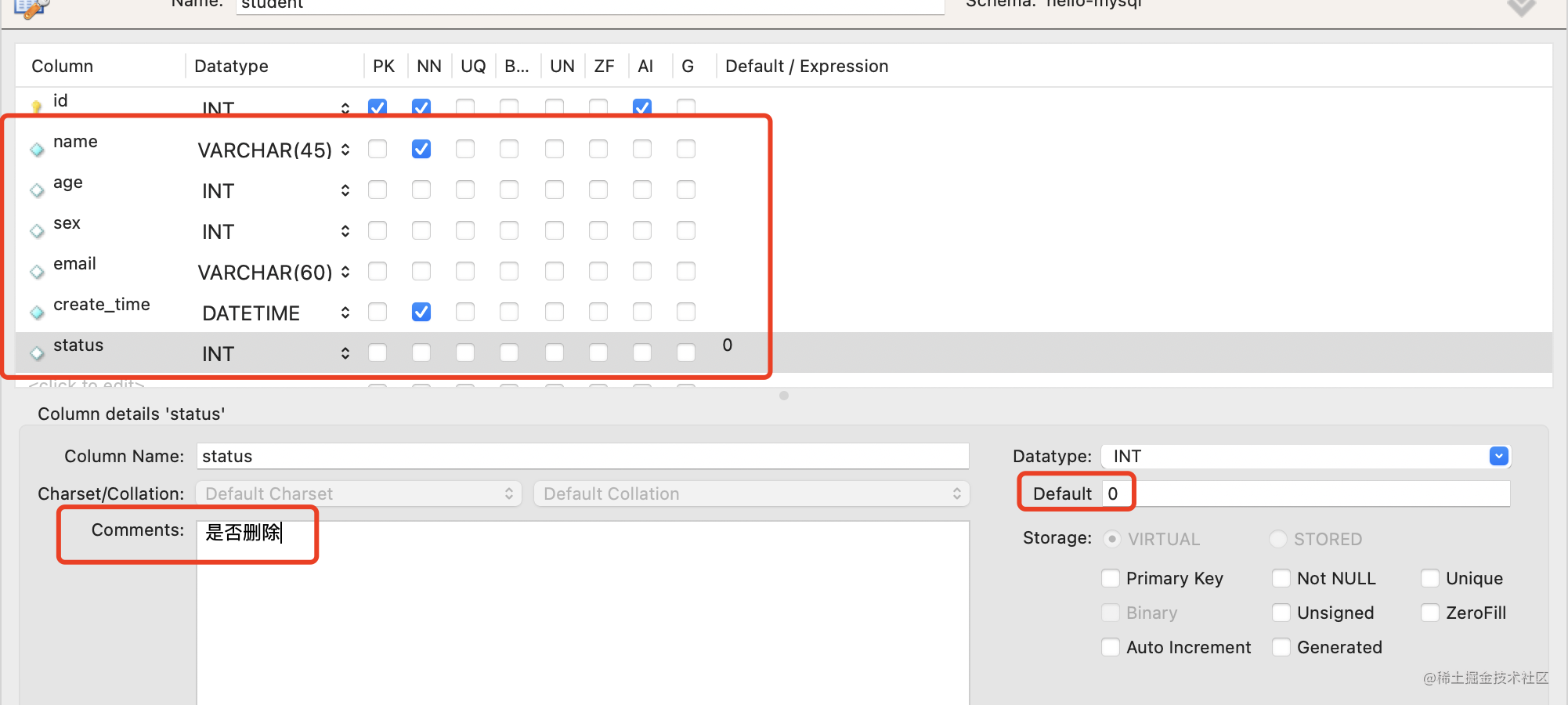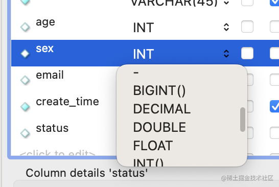 然后依次创建 name、age、sex、email、create_time、status 列: