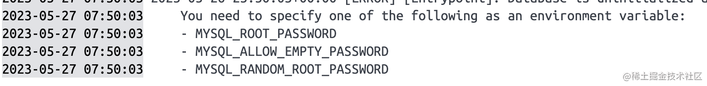 这里还要指定密码 MYSQL_ROOT_PASSWORD,也就是 client 连接 mysql server 的密码。