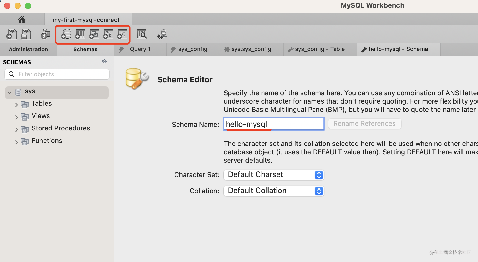 上面这 5 个按钮分别是创建 schema、table、view、stored procedure、function 的。