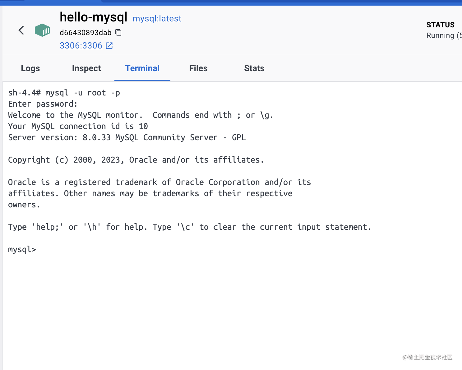 mysql 镜像里带了 mysql 命令行工具,我们先用它连上 mysql server 操作下: