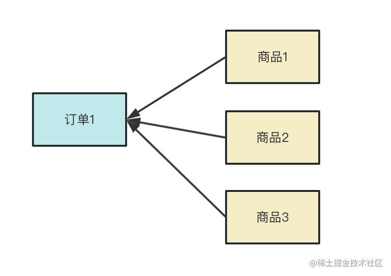 一个订单有多个商品,而商品只属于一个订单。