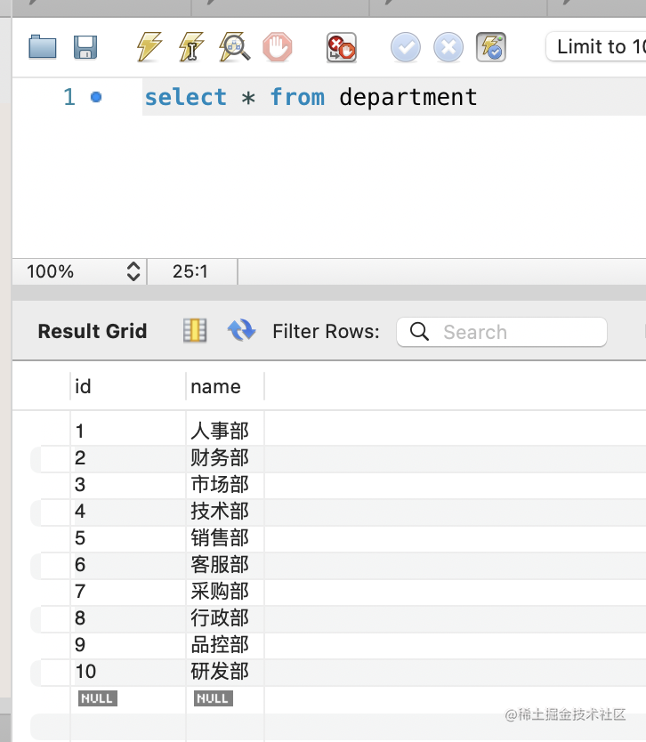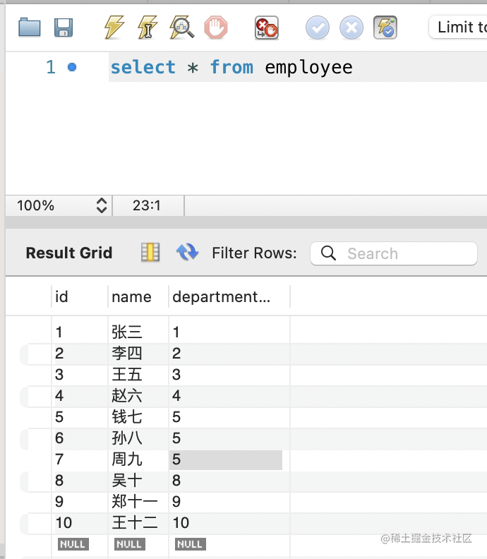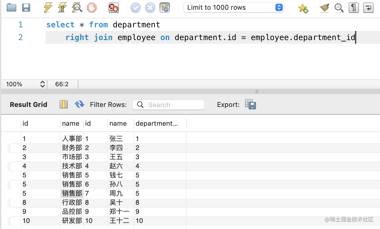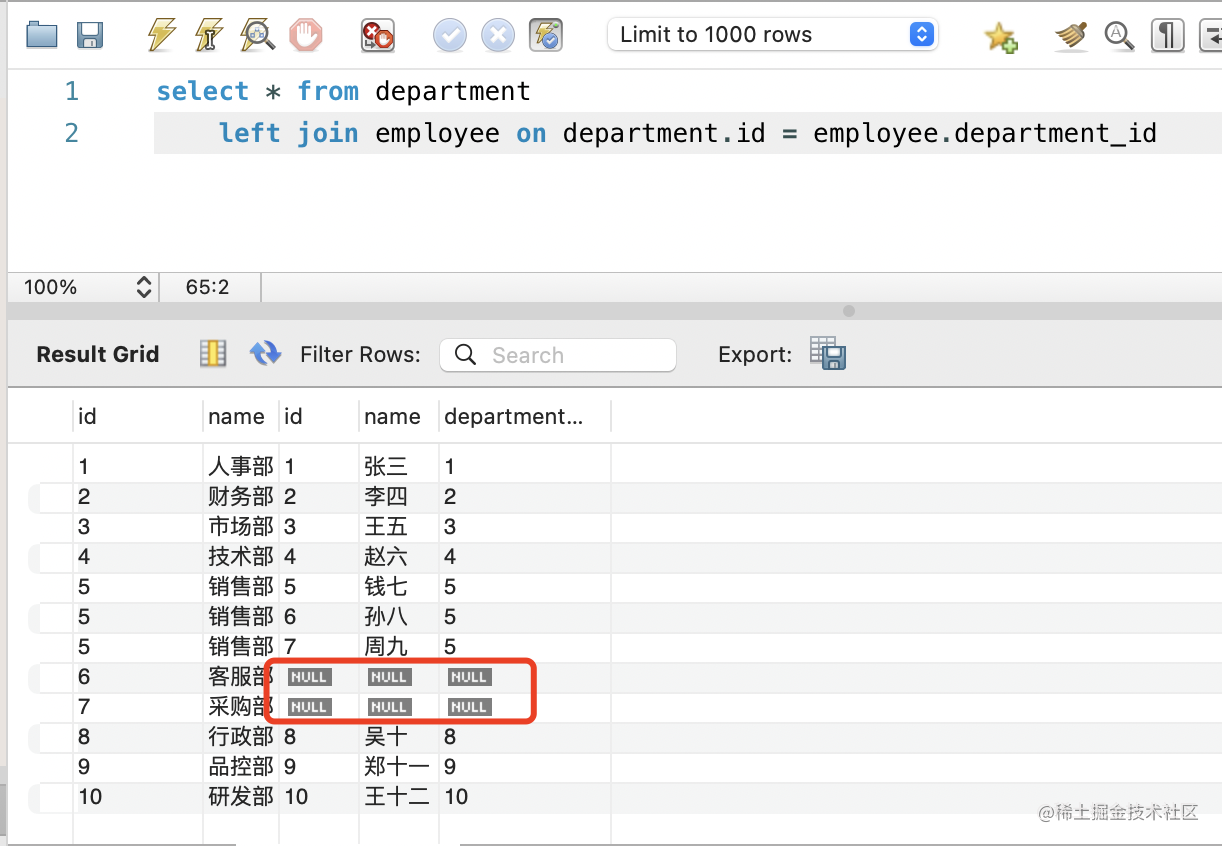 right join employee on department.id = employee.department_id因为所有的员工都是有部门的,所以和 inner join 结果一样: