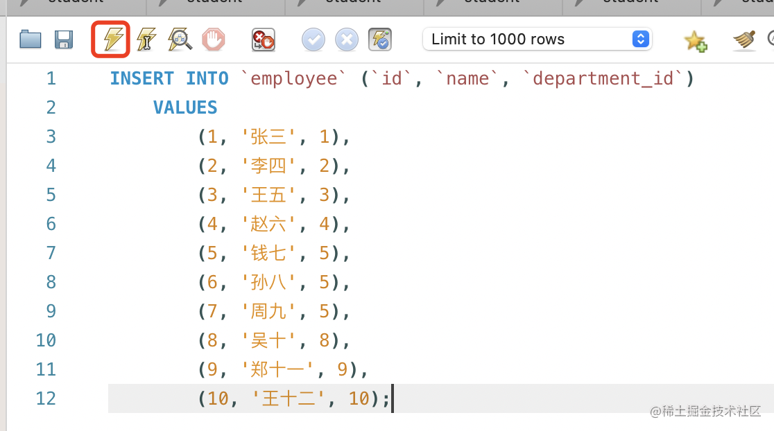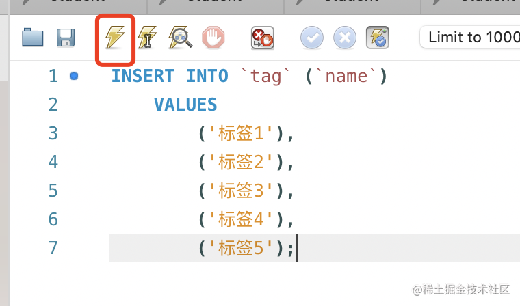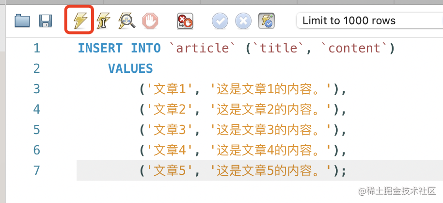 (5,5), (5,1), (5,2);点击左上角按钮,新建一条 sql: