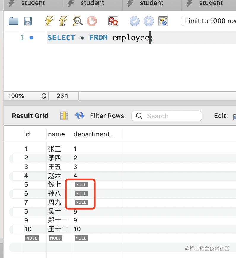 再查看下员工表,可以看到销售部下的 3 个员工的部门被设置为 null 了: