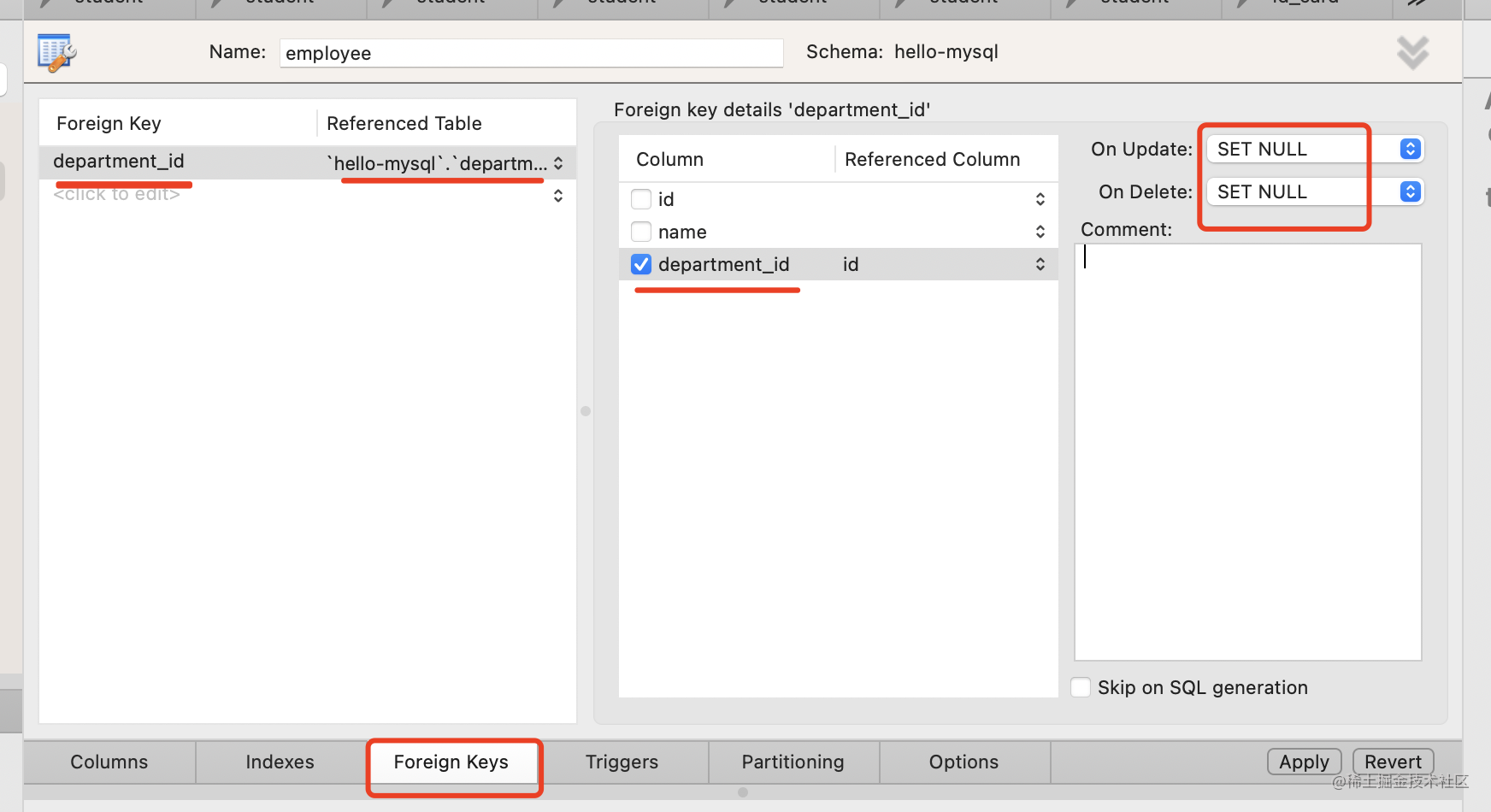 sql 的最后这段,就是创建了一个外键约束,department_id 引用了 department 表的 id,设置级联删除和更新方式为 SET NULL。