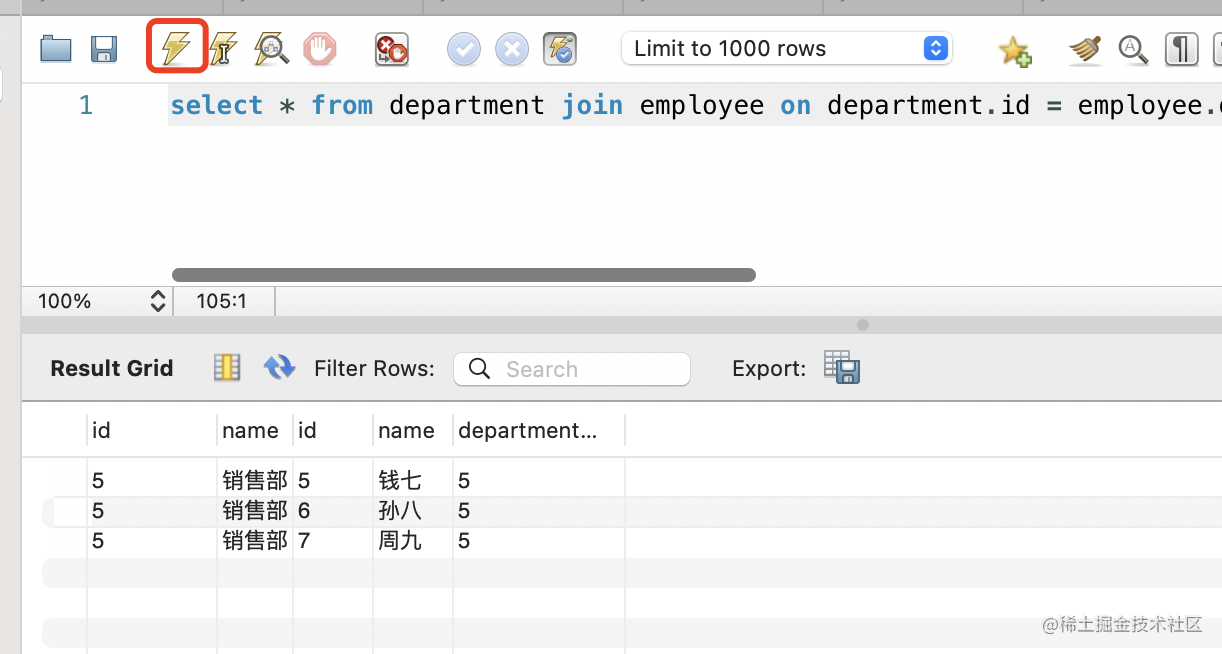 where department.id = 5可以看到,正确查找出了销售部的 3 个员工:
