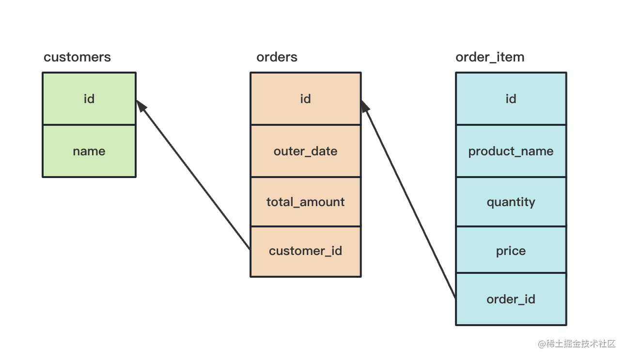 customers 和 orders、orders 和 order_items 都是一对多的关系。