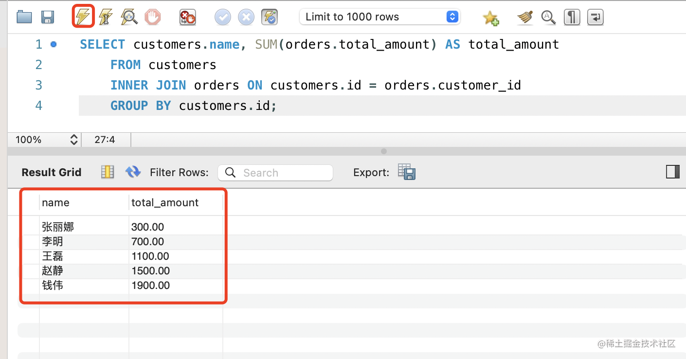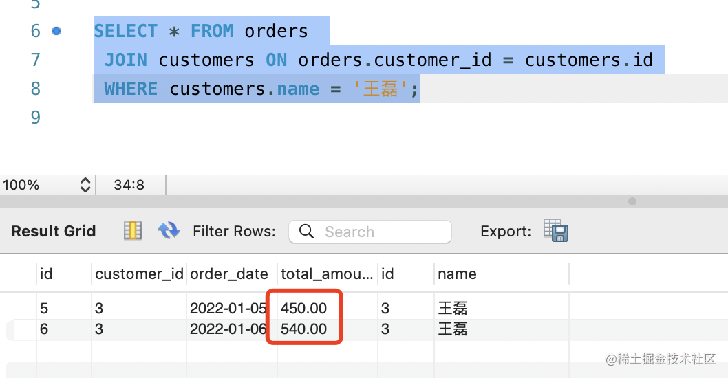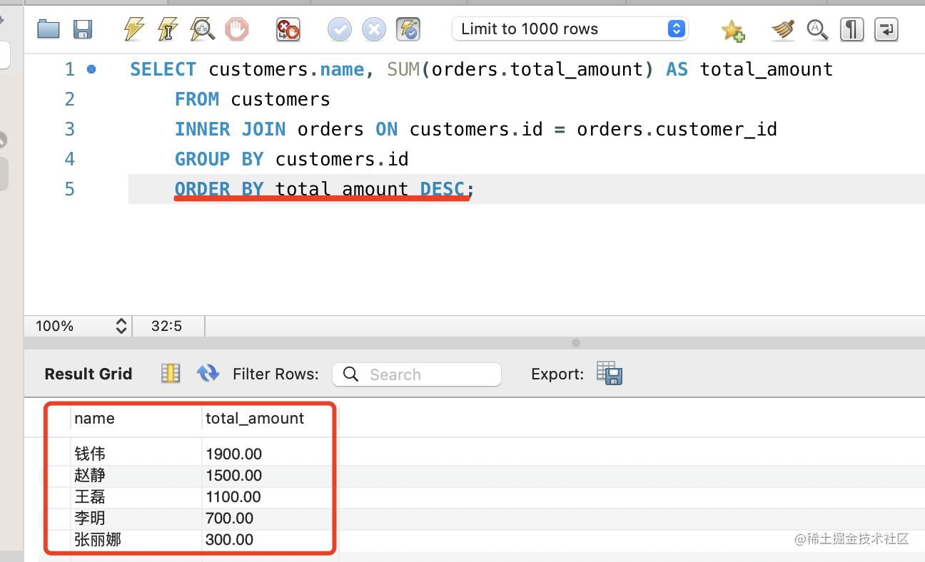 客户的订单存在订单表里,可能有多个,这里需要 JOIN ON 关联两个表,然后用 GROUP BY 根据客户 id 分组,再通过 SUM 函数计算价格总和。