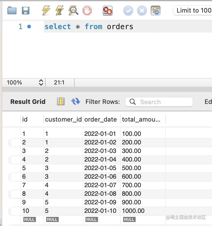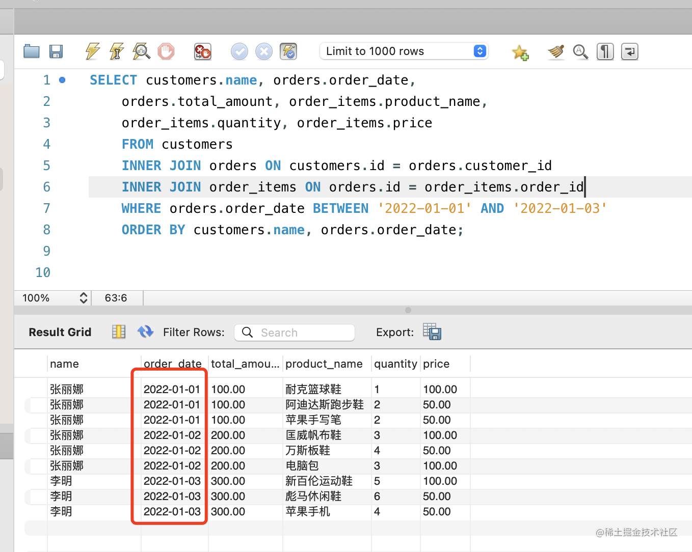 因为这里的 order_date 是 date 类型,所以指定范围也只是用 2022-01-01 这种格式的。如果是 datetime,那就要用 2022-01-01 10:10:00 这种格式了。